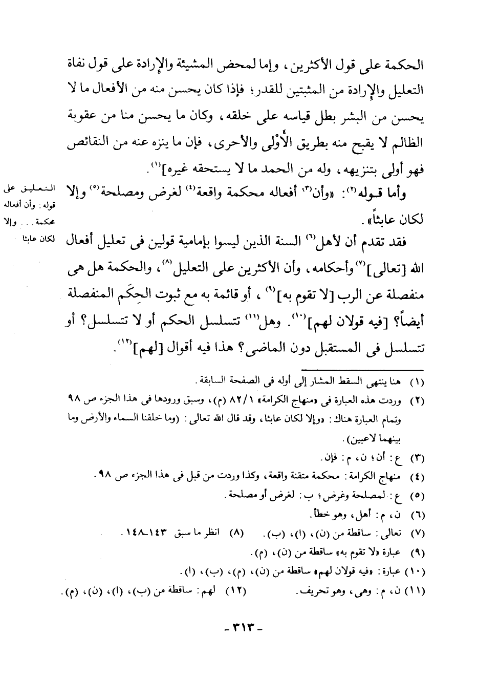 (¬2) وَرَدَتْ هَذِهِ الْعِبَارَةُ فِي " مِنْهَاجِ الْكَرَامَةِ " 1/82 (م) ، وَسَبَقَ وُرُودُهَا فِي هَذَا الْجُزْءِ ص 98 وَتَمَامُ الْعِبَارَةِ هُنَاكَ: " وَإِلَّا لَكَانَ عَابِثًا، وَقَدْ قَالَ اللَّهُ تَعَالَى: (وَمَا خَلَقْنَا السَّمَاءَ وَالْأَرْضَ وَمَا بَيْنَهُمَا لَاعِبِينَ) .