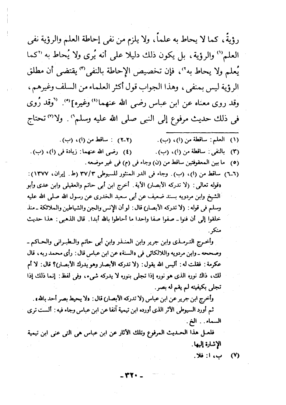(¬6) (6 - 6) سَاقِطٌ مِنْ (أ) ، (ب) . وَجَاءَ فِي الدُّرِّ الْمَنْثُورِ لِلسُّيُوطِيِّ 3/37 (ط. إِيرَانَ، 1377) : " قَوْلُهُ تَعَالَى: (لَا تُدْرِكُهُ الْأَبْصَارُ) الْآيَةَ. أَخْرَجَ ابْنُ أَبِي حَاتِمٍ وَالْعُقَيْلِيُّ وَابْنُ عَدِيٍّ وَأَبُو الشَّيْخِ وَابْنُ مَرْدَوَيْهِ بِسَنَدٍ ضَعِيفٍ عَنْ أَبِي سَعِيدٍ الْخُدْرِيِّ عَنْ رَسُولِ اللَّهِ صَلَّى اللَّهُ عَلَيْهِ وَسَلَّمَ فِي قَوْلِهِ: (لَا تُدْرِكُهُ الْأَبْصَارُ) قَالَ: لَوْ أَنَّ الْإِنْسَ وَالْجِنَّ وَالشَّيَاطِينَ وَالْمَلَائِكَةَ - مُنْذُ خُلِقُوا إِلَى أَنْ فَنَوْا - صُفُّوا صَفًّا وَاحِدً مَا أَحَاطُوا بِاللَّهِ أَبَدًا. قَالَ الذَّهَبِيُّ: هَذَا حَدِيثٌ مُنْكَرٌ. وَأَخْرَجَ التِّرْمِذِيُّ وَابْنُ جَرِيرٍ وَابْنُ الْمُنْذِرِ وَابْنُ أَبِي حَاتِمٍ وَالطَّبَرَانِيُّ وَالْحَاكِمُ - وَصَحَّحَهُ - وَابْنُ مَرْدَوَيْهِ وَاللَّالْكَائِيُّ فِي " السُّنَّةِ " عَنِ ابْنِ عَبَّاسٍ قَالَ: رَأَى مُحَمَّدٌ رَبَّهُ، قَالَ عِكْرِمَةُ: فَقُلْتُ لَهُ: أَلَيْسَ اللَّهُ يَقُولُ: (لَا تُدْرِكُهُ الْأَبْصَارُ وَهُوَ يُدْرِكُ الْأَبْصَارَ) ؟ قَالَ: لَا أُمَّ لَكَ، ذَاكَ نُورُهُ الَّذِي هُوَ نُورُهُ إِذَا تَجَلَّى بِنُورِهِ لَا يُدْرِكُهُ شَيْءٌ، وَفِي لَفْظٍ: إِنَّمَا إِذَا تَجَلَّى بِكَيْفِيَّتِهِ لَمْ يَقُمْ لَهُ بَصَرٌ. وَأَخْرَجَ ابْنُ جَرِيرٍ عَنِ ابْنِ عَبَّاسٍ (لَا تُدْرِكُهُ الْأَبْصَارُ) قَالَ: " لَا يُحِيطُ بَصَرُ أَحَدٍ بِاللَّهِ ". ثُمَّ أَوْرَدَ السُّيُوطِيُّ الْأَثَرَ الَّذِي أَوْرَدَهُ ابْنُ تَيْمِيَّةَ آنِفًا عَنْ ابْنِ عَبَّاسٍ وَجَاءَ فِيهِ: أَلَسْتَ تَرَى السَّمَاءَ. . إِلَخْ. فَلَعَلَّ هَذَا الْحَدِيثَ الْمَرْفُوعَ وَتِلْكَ الْآثَارَ عَنْ ابْنِ عَبَّاسٍ هِيَ الَّتِي عَنَى ابْنُ تَيْمِيَّةَ الْإِشَارَةَ إِلَيْهَا.