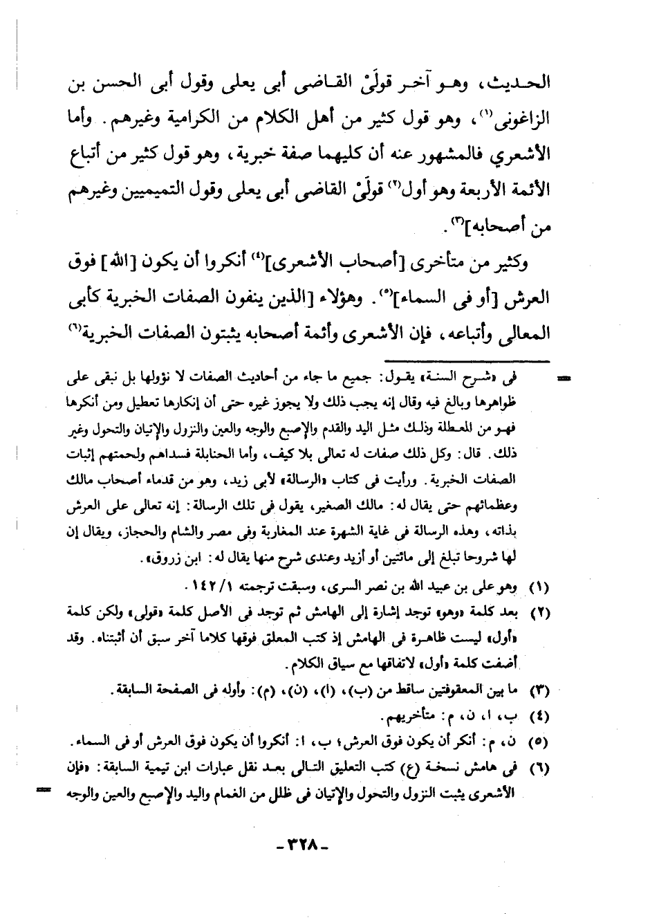 (¬6) فِي هَامِشِ نُسْخَةِ (ع) كُتِبَ التَّعْلِيقُ التَّالِي بَعْدَ نَقْلِ عِبَارَاتِ ابْنِ تَيْمِيَّةَ السَّابِقَةِ: " فَإِنَّ الْأَشْعَرِيَّ يُثْبِتُ النُّزُولَ وَالتَّحَوُّلَ وَالْإِتْيَانَ فِي ظُلَلٍ مِنَ الْغَمَامِ وَالْيَدِ وَالْإِصْبَعِ وَالْعَيْنِ وَالْوَجْهِ وَالْقَدَمِ وَالْجَنْبِ وَغَيْرِهَا مِمَّا ثَبَتَ فِي الْأَحَادِيثِ، وَرَأَيْتُ كَلَامَهُ فِي كِتَابِ " الْإِبَانَةِ " يُشْعِرُ بِأَنَّهُ مِنْ أَتْبَاعِ أَحْمَدَ بْنِ حَنْبَلٍ وَأَنَّهُ يَعْتَقِدُ كُلَّ مَا يَعْتَقِدُ أَحْمَدُ بْنُ حَنْبَلٍ إِلَّا أَنَّ الْمُتَأَخِّرِينَ غَيَّرُوا مَسْلَكَهُ وَخَالَفُوهُ فِي كَثِيرٍ مِمَّا قَالَ بِهِ فَظَنَّ النَّاظِرُونَ فِي كَلَامِهِمْ أَنَّ كَلَامَ الْأَشْعَرِيِّ كَذَلِكَ ".