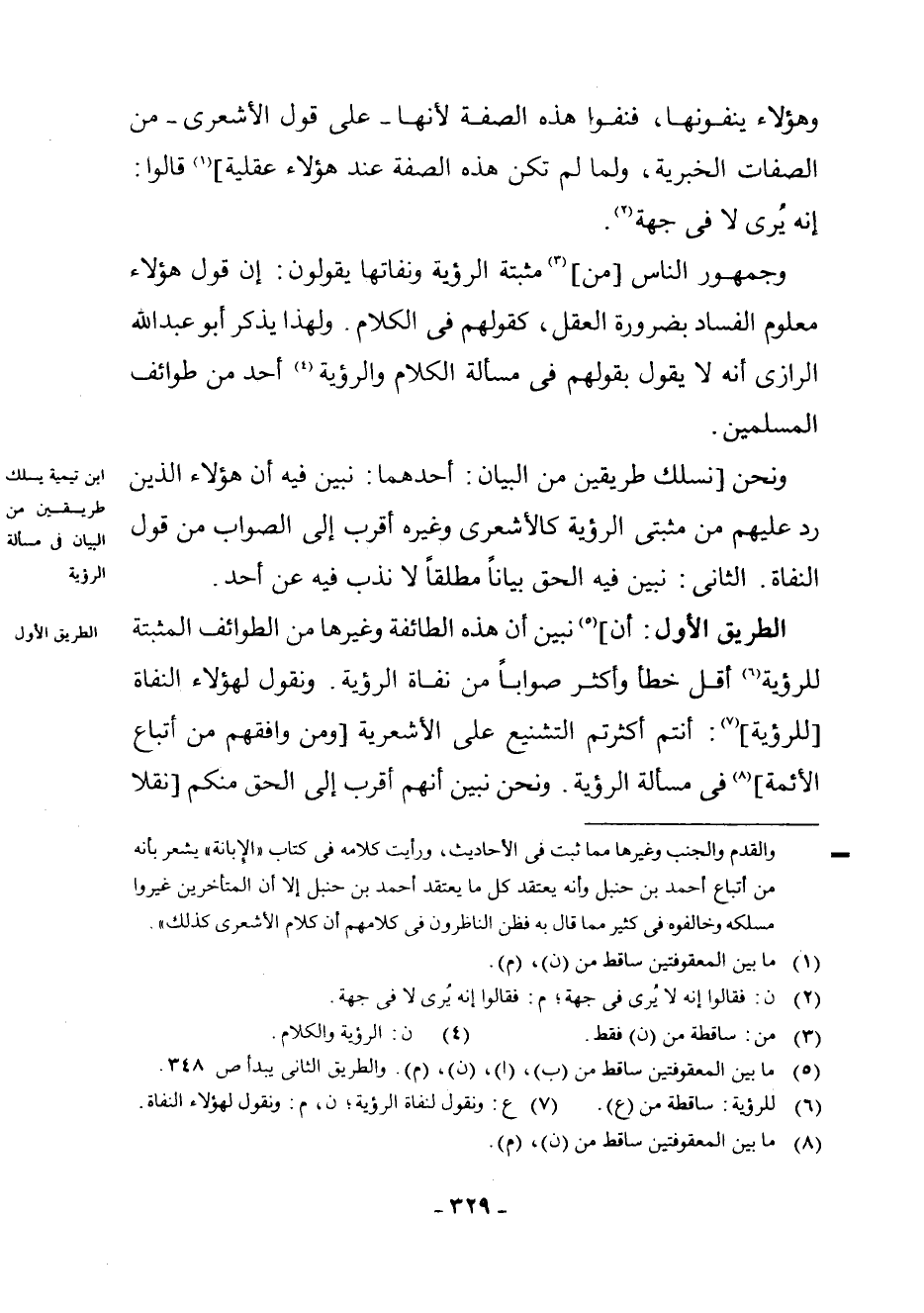 وَنَحْنُ [نَسْلُكُ طَرِيقَيْنِ مِنَ الْبَيَانِ: أَحَدُهُمَا: نُبَيِّنُ فِيهِ أَنَّ هَؤُلَاءِ الَّذِينَ رَدَّ عَلَيْهِمْ مِنْ مُثْبِتِيِ الرُّؤْيَةِ كَالْأَشْعَرِيِّ وَغَيْرِهِ أَقْرَبُ إِلَى الصَّوَابِ مِنْ قَوْلِ النُّفَاةِ. الثَّانِي: نُبَيِّنُ فِي الْحَقِّ بَيَانًا مُطْلَقًا لَا نَذُبُّ فِيهِ عَنْ أَحَدٍ.