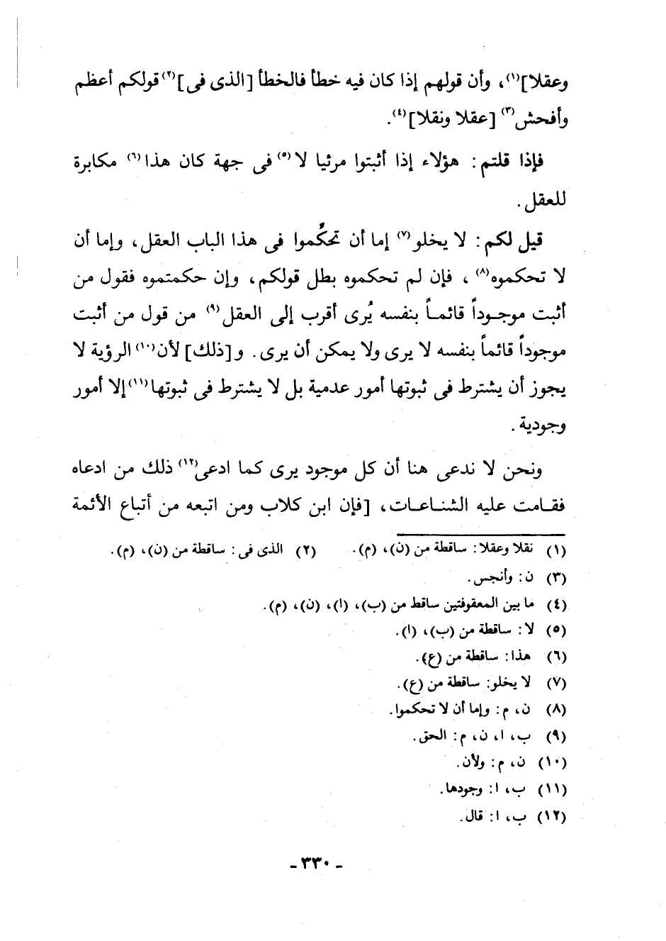 قِيلَ لَكُمْ: لَا يَخْلُو (¬7) إِمَّا أَنْ تُحَكِّمُوا فِي هَذَا الْبَابِ الْعَقْلَ، وَإِمَّا أَنْ لَا تُحَكِّمُوهُ (¬8) ، فَإِنْ لَمْ تُحَكِّمُوهُ بَطَلَ قَوْلُكُمْ، وَإِنْ حَكَّمْتُمُوهُ فَقَوْلُ مَنْ أَثْبَتَ مَوْجُودًا قَائِمًا بِنَفْسِهِ يُرَى أَقْرَبَ إِلَى الْعَقْلِ (¬9) مِنْ قَوْلِ مَنْ أَثْبَتَ مَوْجُودًا قَائِمًا بِنَفْسِهِ لَا يُرَى. وَلَا يُمْكِنُ أَنْ يُرَى. وَ [ذَلِكَ] لِأَنَّ (¬10) الرُّؤْيَةَ لَا يَجُوزُ أَنْ يُشْتَرَطَ فِي ثُبُوتِهَا أُمُورٌ عَدَمِيَّةٌ بَلْ لَا يُشْتَرَطُ فِي ثُبُوتِهَا (¬11) إِلَّا أُمُورٌ وُجُودِيَّةٌ.