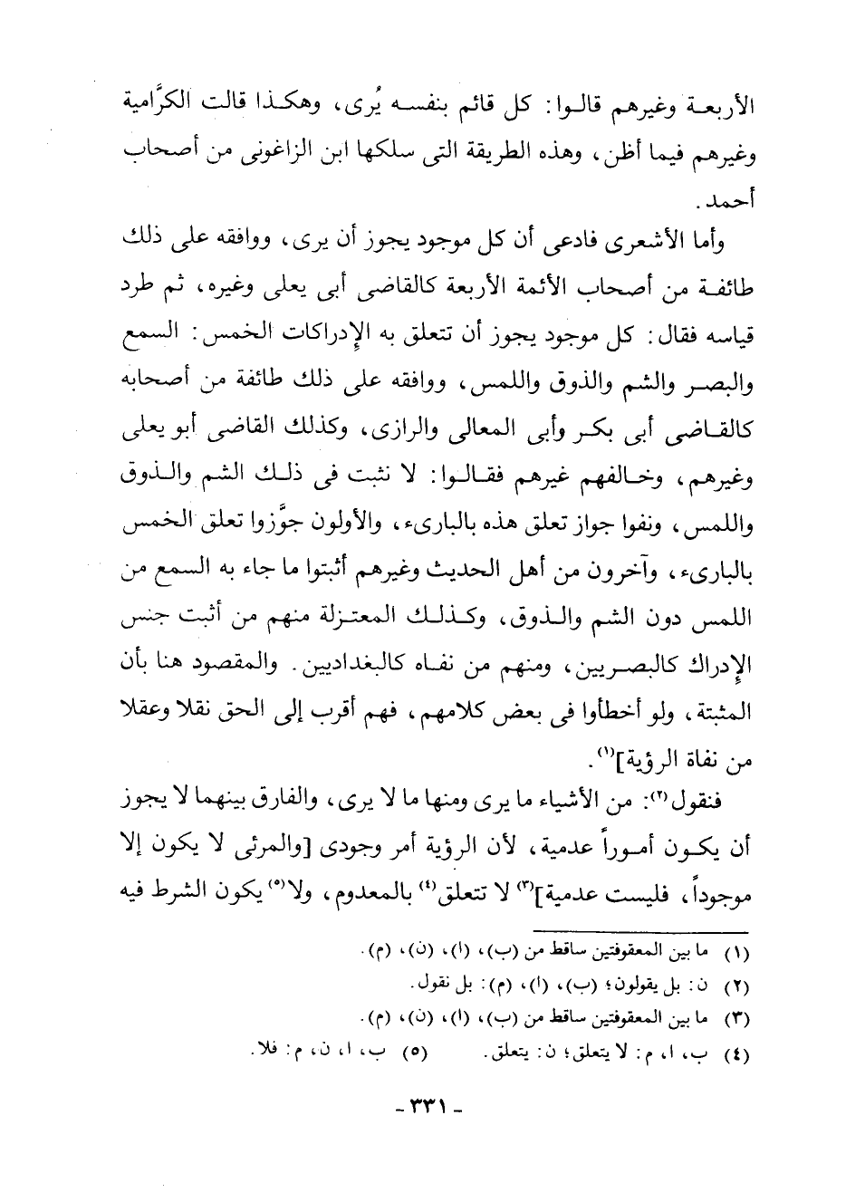 وَأَمَّا الْأَشْعَرِيُّ فَادَّعَى أَنَّ كُلَّ مَوْجُودٍ يَجُوزُ أَنْ يُرَى، وَوَافَقَهُ عَلَى ذَلِكَ طَائِفَةٌ مِنْ أَصْحَابِ الْأَئِمَّةِ الْأَرْبَعَةِ كَالْقَاضِي أَبِي يَعْلَى وَغَيْرِهِ، ثُمَّ طَرَّدَ قِيَاسَهُ فَقَالَ: كُلُّ مَوْجُودٍ يَجُوزُ أَنْ تَتَعَلَّقَ بِهِ الْإِدْرَاكَاتُ الْخَمْسُ: السَّمْعُ وَالْبَصَرُ وَالشَّمُّ وَالذَّوْقُ وَاللَّمْسُ، وَوَافَقَهُ عَلَى ذَلِكَ طَائِفَةٌ مِنْ أَصْحَابِهِ كَالْقَاضِي أَبِي بَكْرٍ وَأَبِي الْمَعَالِي وَالرَّازِيِّ، وَكَذَلِكَ الْقَاضِي أَبُو يَعْلَى وَغَيْرُهُمْ، وَخَالَفَهُمْ غَيْرُهُمْ فَقَالُوا: لَا نُثْبِتُ فِي ذَلِكَ الشَّمَّ وَالذَّوْقَ وَاللَّمْسَ، وَنَفَوْا جَوَازَ تَعَلُّقِ هَذِهِ بِالْبَارِئِ، وَالْأَوَّلُونَ جَوَّزُوا تَعَلُّقَ الْخَمْسِ بِالْبَارِئِ، وَآخَرُونَ مِنْ أَهْلِ الْحَدِيثِ وَغَيْرِهِمْ أَثْبَتُوا مَا جَاءَ بِهِ السَّمْعُ مِنَ اللَّمْسِ دُونَ الشَّمِّ وَالذَّوْقِ، وَكَذَلِكَ الْمُعْتَزِلَةُ مِنْهُمْ مَنْ أَثْبَتَ جِنْسَ الْإِدْرَاكِ كَالْبَصْرِيِّينَ، وَمِنْهُمْ مَنْ نَفَاهُ كَالْبَغْدَادِيِّينَ. وَالْمَقْصُودُ هُنَا بِأَنَّ الْمُثْبِتَةَ، وَلَوْ أَخْطَئُوا فِي بَعْضِ كَلَامِهِمْ فَهُمْ أَقْرَبُ إِلَى الْحَقِّ نَقْلًا وَعَقْلًا مِنْ نُفَاةِ الرُّؤْيَةِ] (¬1) .