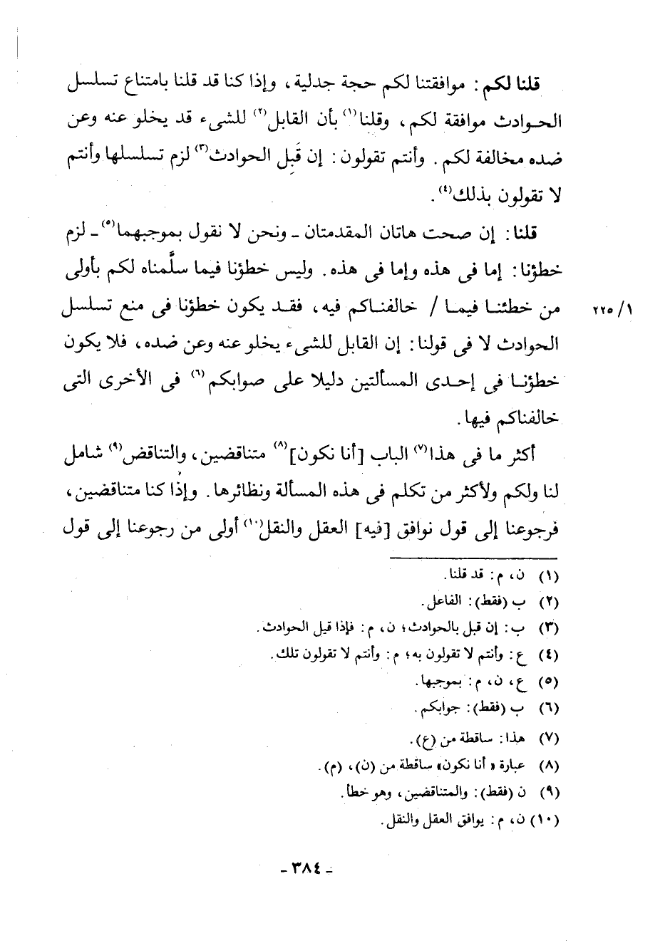 قُلْنَا لَكُمْ: مُوَافَقَتُنَا لَكُمْ حُجَّةٌ جَدَلِيَّةٌ، وَإِذَا كُنَّا قَدْ قُلْنَا بِامْتِنَاعِ تَسَلْسُلِ الْحَوَادِثِ مُوَافَقَةً لَكُمْ، وَقُلْنَا (¬1) بِأَنَّ الْقَابِلَ (¬2) لِلشَّيْءِ قَدْ يَخْلُو عَنْهُ وَعَنْ ضِدِّهِ مُخَالَفَةً لَكُمْ. وَأَنْتُمْ تَقُولُونَ: إِنْ قَبِلَ الْحَوَادِثَ (¬3) لَزِمَ تَسَلْسُلُهَا وَأَنْتُمْ لَا تَقُولُونَ بِذَلِكَ (¬4) .