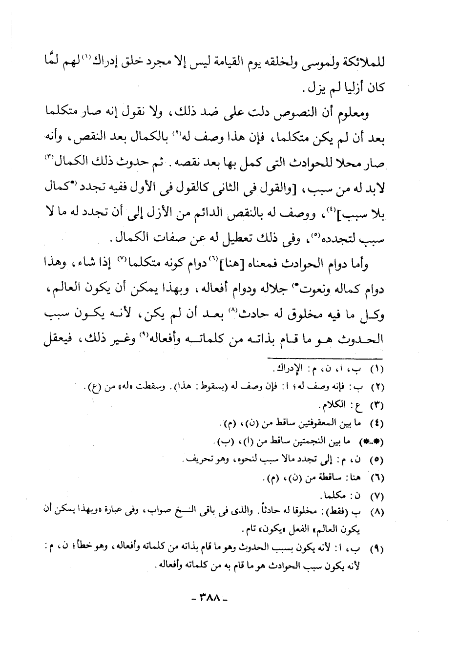(¬10) ب، ا: لِأَنَّهُ يَكُونُ بِسَبَبِ الْحُدُوثِ وَهُوَ مَا قَامَ بِذَاتِهِ مِنْ كَلِمَاتِهِ وَأَفْعَالِهِ، وَهُوَ خَطَأٌ ; ن، م: لِأَنَّهُ يَكُونُ سَبَبُ الْحَوَادِثِ هُوَ مَا قَامَ بِهِ مِنْ كَلِمَاتِهِ وَأَفْعَالِهِ.