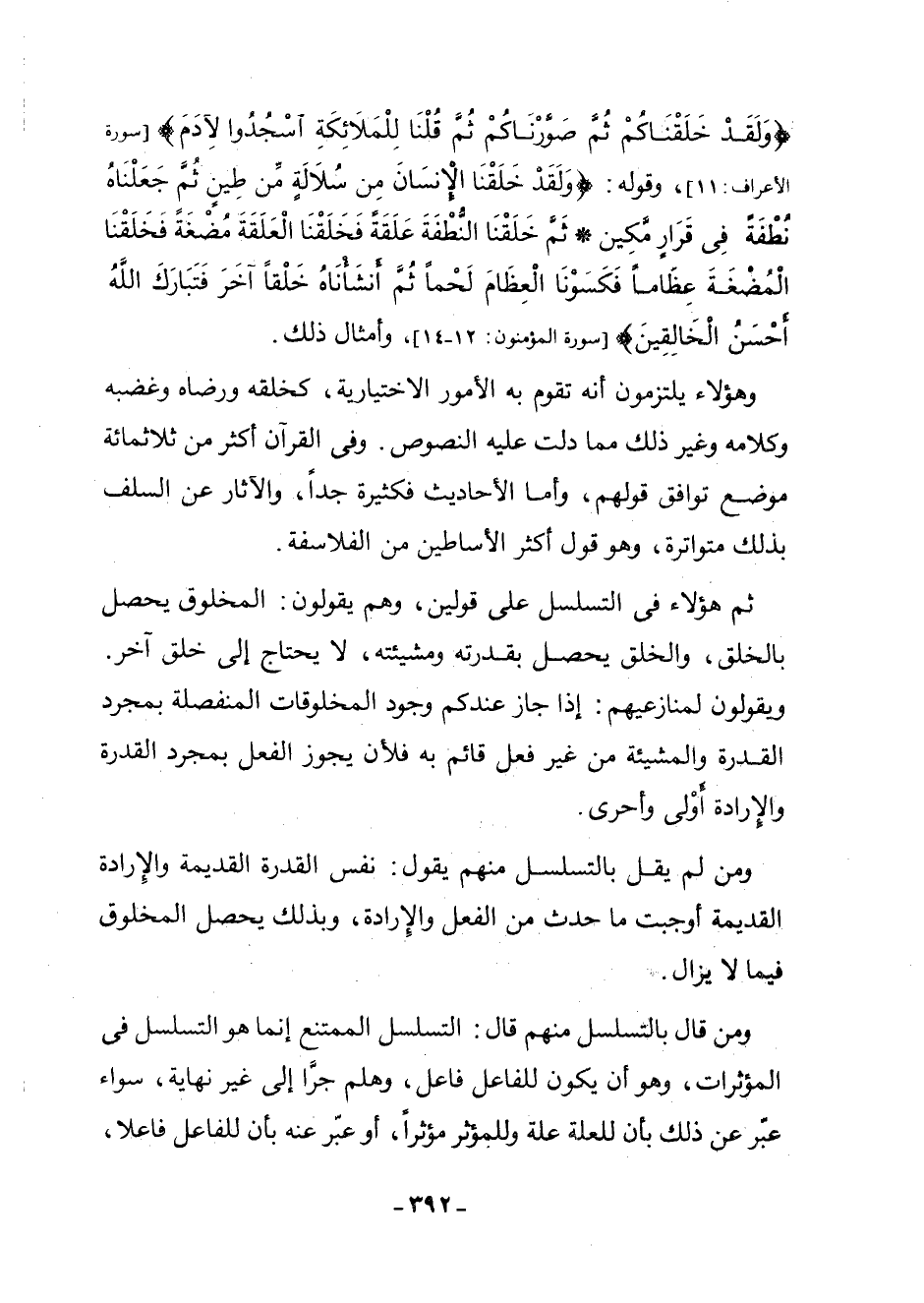 وَهُؤُلَاءِ يَلْتَزِمُونَ أَنَّهُ تَقُومُ بِهِ الْأُمُورُ الِاخْتِيَارِيَّةُ، كَخَلْقِهِ وَرِضَاهُ وَغَضَبِهِ وَكَلَامِهِ وَغَيْرِ ذَلِكَ مِمَّا دَلَّتْ عَلَيْهِ النُّصُوصُ. وَفِي الْقُرْآنِ أَكْثَرُ مِنْ ثَلَاثِمِائَةِ مَوْضِعٍ تُوَافِقُ قَوْلَهُمْ، وَأَمَّا الْأَحَادِيثُ فَكَثِيرَةٌ جِدًّا، وَالْآثَارُ عَنِ السَّلَفِ بِذَلِكَ مُتَوَاتِرَةٌ، وَهُوَ قَوْلُ أَكْثَرِ الْأَسَاطِينِ مِنَ الْفَلَاسِفَةِ. ثُمَّ هَؤُلَاءِ فِي التَّسَلْسُلِ عَلَى قَوْلَيْنِ، وَهُمْ يَقُولُونَ: الْمَخْلُوقُ يَحْصُلُ بِالْخَلْقِ، وَالْخَلْقُ يَحْصُلُ بِقُدْرَتِهِ وَمَشِيئَتِهِ، لَا يَحْتَاجُ إِلَى خَلْقٍ آخَرَ. 0 وَيَقُولُونَ لِمُنَازِعِيهِمْ: إِذَا جَازَ عِنْدَكُمْ وُجُودُ الْمَخْلُوقَاتِ الْمُنْفَصِلَةِ بِمُجَرَّدِ الْقُدْرَةِ وَالْمَشِيئَةِ مِنْ غَيْرِ فِعْلٍ قَائِمٍ بِهِ، فَلِأَنْ يَجُوزَ الْفِعْلُ بِمُجَرَّدِ الْقُدْرَةِ الْإِرَادَةُ أَوْلَى وَأَحْرَى. وَمَنْ لَمْ يَقُلْ بِالتَّسَلْسُلِ مِنْهُمْ يَقُولُ: نَفْسُ الْقُدْرَةِ الْقَدِيمَةِ وَالْإِرَادَةِ الْقَدِيمَةِ أَوْجَبَتْ مَا حَدَثَ مِنَ الْفِعْلِ وَالْإِرَادَةِ وَبِذَلِكَ يَحْصُلُ الْمَخْلُوقُ فِيمَا لَا يَزَالُ.