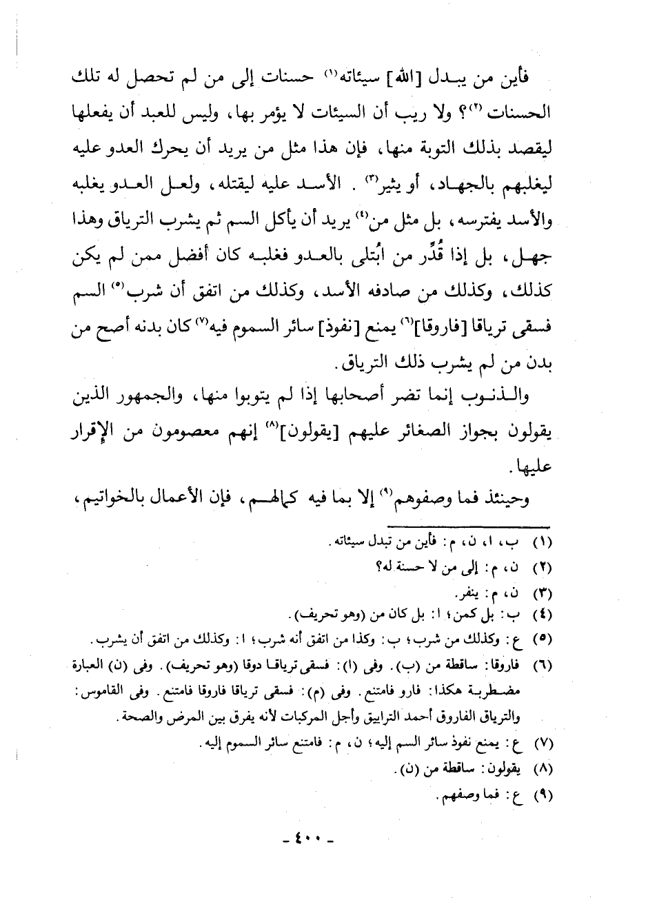 فَأَيْنَ مَنْ يُبَدِّلُ [اللَّهُ] سَيِّئَاتِهِ (¬1) حَسَنَاتٍ إِلَى مَنْ لَمْ تَحْصُلْ لَهُ تِلْكَ الْحَسَنَاتُ (¬2) ؟ وَلَا رَيْبَ أَنَّ السَّيِّئَاتِ لَا يُؤْمَرُ بِهَا، وَلَيْسَ لِلْعَبْدِ أَنْ يَفْعَلَهَا لِيَقْصِدَ بِذَلِكَ التَّوْبَةَ مِنْهَا، فَإِنَّ هَذَا مِثْلُ مَنْ يُرِيدُ أَنْ يُحَرِّكَ الْعَدُوَّ عَلَيْهِ لِيَغْلِبَهُمْ بِالْجِهَادِ، أَوْ يُثِيرَ (¬3) الْأَسَدَ عَلَيْهِ لِيَقْتُلَهُ، وَلَعَلَّ الْعَدُوَّ يَغْلِبُهُ وَالْأَسَدَ يَفْتَرِسُهُ، بَلْ مِثْلُ (¬4) مَنْ يُرِيدُ أَنْ يَأْكُلَ السُّمَّ ثُمَّ يَشْرَبُ التِّرْيَاقَ وَهَذَا جَهْلٌ، بَلْ إِذَا قَدَرَ مَنِ ابْتُلِيَ بِالْعَدُوِّ فَغَلَبَهُ كَانَ أَفْضَلَ مِمَّنْ لَمْ يَكُنْ كَذَلِكَ، وَكَذَلِكَ مَنْ صَادَفَهُ الْأَسَدُ وَكَذَلِكَ مَنِ اتَّفَقَ أَنْ شَرِبَ (¬5) السُّمَّ فَسُقِيَ تِرْيَاقًا [فَارُوقًا] (¬6) يَمْنَعُ [نُفُوذَ] سَائِرِ السُّمُومِ فِيهِ (¬7) كَانَ بَدَنُهُ أَصَحَّ مِنْ بَدْنِ مَنْ لَمْ يَشْرَبْ ذَلِكَ التِّرْيَاقَ. وَالذُّنُوبُ إِنَّمَا تَضُرُّ أَصْحَابَهَا إِذَا لَمْ يَتُوبُوا مِنْهَا، وَالْجُمْهُورُ الَّذِينَ يَقُولُونَ بِجَوَازِ الصَّغَائِرِ عَلَيْهِمْ. [يَقُولُونَ] (¬8) إِنَّهُمْ مَعْصُومُونَ مِنَ الْإِقْرَارِ عَلَيْهَا.
