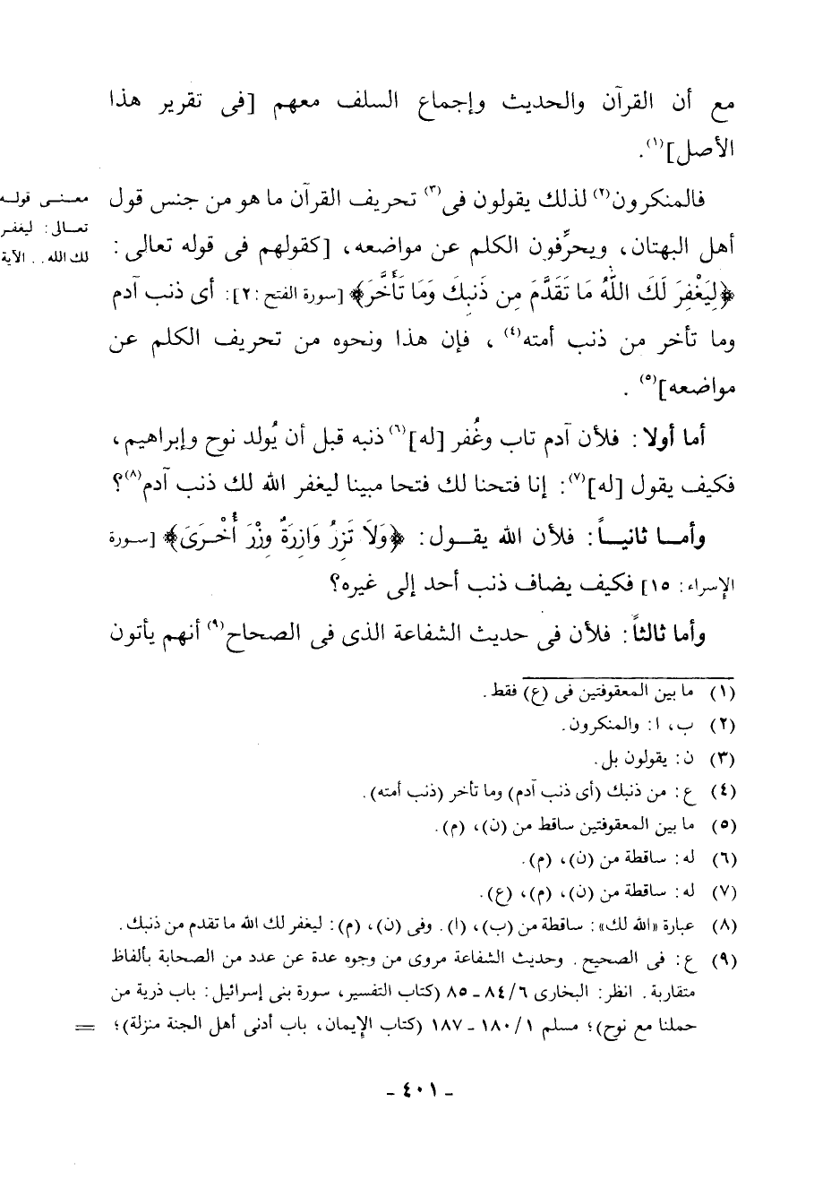 فَالْمُنْكِرُونَ (¬2) لِذَلِكَ يَقُولُونَ فِي (¬3) تَحْرِيفِ الْقُرْآنِ مَا هُوَ مِنْ جِنْسِ قَوْلِ أَهْلِ الْبُهْتَانِ، وَيُحَرِّفُونَ الْكَلِمَ عَنْ مَوَاضِعِهِ [كَقَوْلِهِمْ فِي قَوْلِهِ تَعَالَى: {لِيَغْفِرَ لَكَ اللَّهُ مَا تَقَدَّمَ مِنْ ذَنْبِكَ وَمَا تَأَخَّرَ} [سُورَةُ الْفَتْحِ: 2] أَيْ: ذَنْبُ آدَمَ وَمَا تَأَخَّرَ مِنْ ذَنْبِ أُمَّتِهِ (¬4) ، فَإِنَّ هَذَا وَنَحْوَهُ مِنْ تَحْرِيفِ الْكَلِمِ عَنْ مَوَاضِعِهِ] (¬5) . أَمَّا أَوَّلًا: فَلِأَنَّ آدَمَ تَابَ وَغُفِرَ [لَهُ] (¬6) ذَنْبُهُ قَبْلَ أَنْ يُولَدَ نُوحٌ وَإِبْرَاهِيمُ، فَكَيْفَ يَقُولُ [لَهُ] (¬7) : {إِنَّا فَتَحْنَا لَكَ فَتْحًا مُبِينًا} لِيَغْفِرَ اللَّهُ لَكَ ذَنْبَ آدَمَ (¬8) ؟ وَأَمَّا ثَانِيًا: فَلِأَنَّ اللَّهَ يَقُولُ: {وَلَا تَزِرُ وَازِرَةٌ وِزْرَ أُخْرَى} [سُورَةُ الْإِسْرَاءِ: 15] فَكَيْفَ يُضَافُ ذَنْبُ أَحَدٍ إِلَى غَيْرِهِ؟