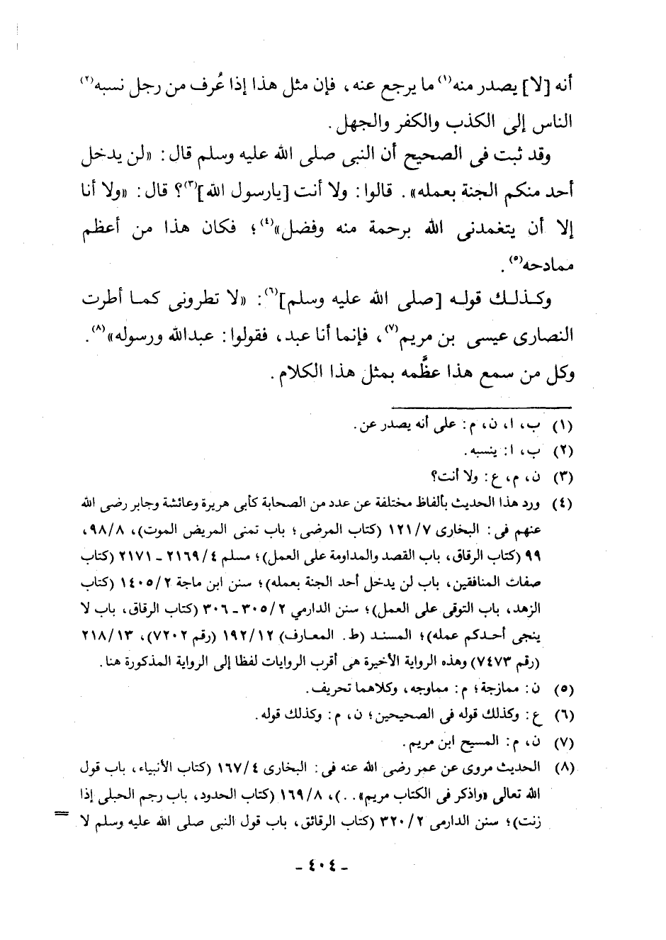 (¬4) وَرَدَ هَذَا الْحَدِيثُ بِأَلْفَاظٍ مُخْتَلِفَةٍ عَنْ عَدَدٍ مِنَ الصَّحَابَةِ كَأَبِي هُرَيْرَةَ وَعَائِشَةَ وَجَابِرٍ رَضِيَ اللَّهُ عَنْهُمْ فِي: الْبُخَارِيِّ 7/121 (كِتَابُ الْمَرْضَى ; بَابُ تَمَنِّي الْمَرِيضِ الْمَوْتَ) ، 8/98، 99 (كِتَابُ الرِّقَاقِ، بَابُ الْقَصْدِ وَالْمُدَاوَمَةِ عَلَى الْعَمَلِ) ; مُسْلِمٍ 4/2169 - 2171 (كِتَابُ صِفَاتِ الْمُنَافِقِينَ، بَابُ لَنْ يَدْخُلَ أَحَدٌ الْجَنَّةَ بِعَمَلِهِ) ; سُنَنِ ابْنِ مَاجَهْ 2/1405 (كِتَابُ الزُّهْدِ، بَابُ التَّوَقِّي عَلَى الْعَمَلِ) ; سُنَنِ الدَّارِمِيِّ 2/305 - 306 (كِتَابُ الرِّقَاقِ، بَابُ لَا يُنْجِي أَحَدَكُمْ عَمَلُهُ) ; الْمُسْنَدِ (ط. الْمَعَارِفِ) 12/192 (رَقْمُ 7202) ، 13/218 (رَقْمُ 7473) وَهَذِهِ الرِّوَايَةُ الْأَخِيرَةُ هِيَ أَقْرَبُ الرِّوَايَاتِ لَفْظًا إِلَى الرِّوَايَةِ الْمَذْكُورَةِ هُنَا.
