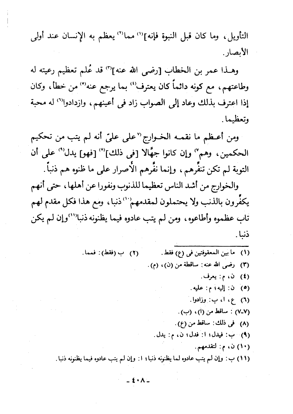 وَمِنْ أَعْظَمِ مَا نَقِمَهُ الْخَوَارِجُ (7 عَلَى عَلِيٍّ أَنَّهُ لَمْ يَتُبْ مِنْ تَحْكِيمِ الْحَكَمَيْنِ، وَهُمْ 7) (¬6) . وَإِنْ كَانُوا جُهَّالًا [فِي ذَلِكَ] (¬7) . [فَهُوَ] يَدُلُّ (¬8) . عَلَى أَنَّ التَّوْبَةَ لَمْ تَكُنْ تُنَفِّرُهُمْ، وَإِنَّمَا نَفَّرَهُمُ الْإِصْرَارُ عَلَى مَا ظَنُّوهُ هُمْ ذَنْبًا. وَالْخَوَارِجُ مِنْ أَشَدِّ النَّاسِ تَعْظِيمًا لِلذُّنُوبِ وَنُفُورًا عَنْ أَهْلِهَا، حَتَّى إِنَّهُمْ يُكَفِّرُونَ بِالذَّنْبِ وَلَا يَحْتَمِلُونَ لِمُقَدَّمِهِمْ ن (¬9) . ذَنْبًا، وَمَعَ هَذَا فَكُلُّ مُقَدَّمٍ لَهُمْ تَابَ عَظَّمُوهُ وَأَطَاعُوهُ، وَمَنْ لَمْ يَتُبْ عَادُوهُ فِيمَا يَظُنُّونَهُ ذَنْبًا (¬10) . وَإِنْ لَمْ يَكُنْ ذَنْبًا.