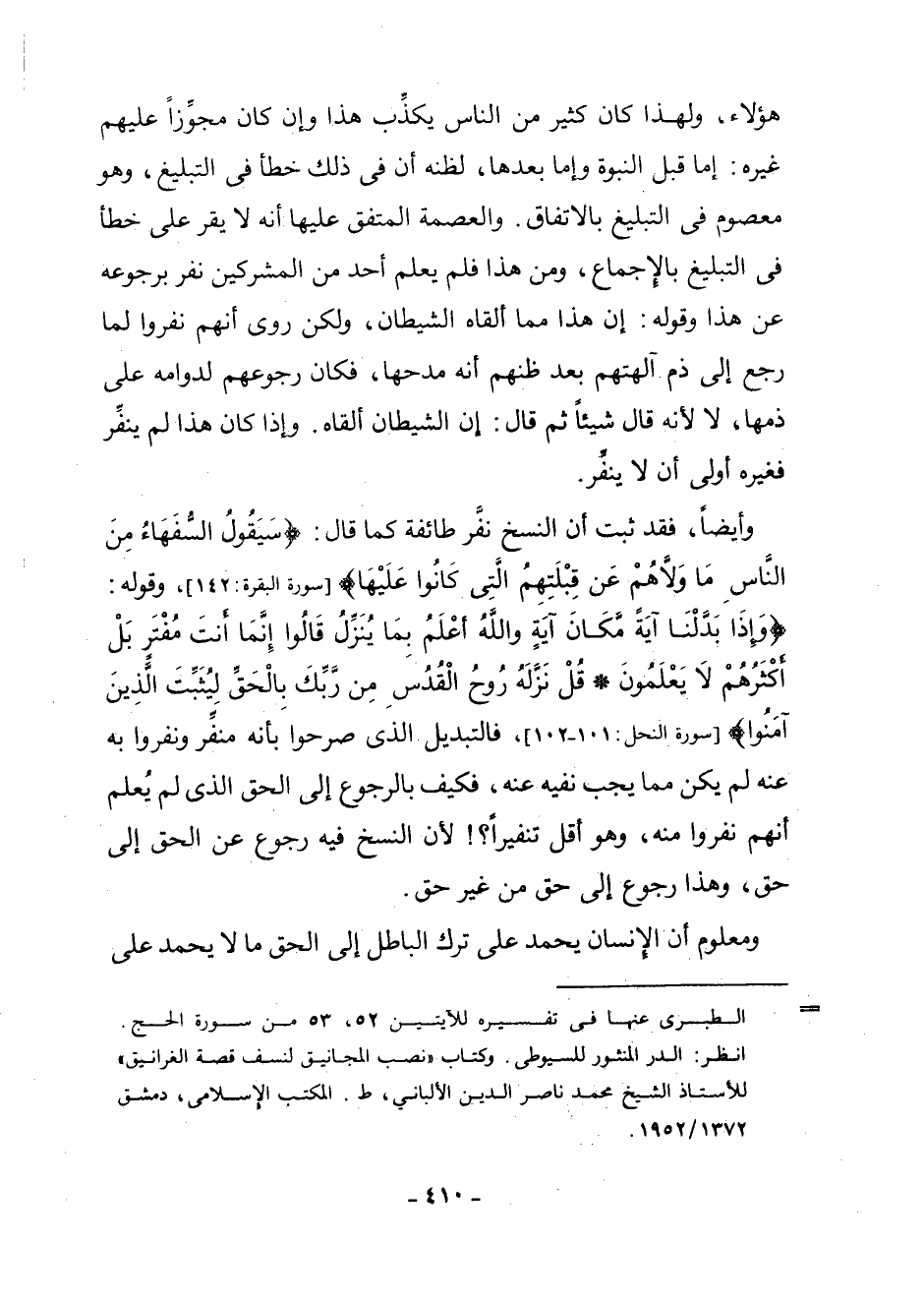 هَؤُلَاءِ، وَلِهَذَا كَانَ كَثِيرٌ مِنَ النَّاسِ يُكَذِّبُ هَذَا وَإِنْ كَانَ مُجَوِّزًا عَلَيْهِمْ غَيْرَهُ: إِمَّا قَبْلَ النُّبُوةِ وَإِمَّا بَعْدَهَا، لِظَنِّهِ أَنَّ فِي ذَلِكَ خَطَأً فِي التَّبْلِيغِ، وَهُوَ مَعْصُومٌ فِي التَّبْلِيغِ بِالِاتِّفَاقِ. وَالْعِصْمَةُ الْمُتَّفَقُ عَلَيْهَا أَنَّهُ لَا يُقِرُّ عَلَى خَطَأٍ فِي التَّبْلِيغِ بِالْإِجْمَاعِ، وَمِنْ هَذَا فَلَمْ يُعْلَمُ أَحَدٌ مِنَ الْمُشْرِكِينَ نَفَرَ بِرُجُوعِهِ عَنْ هَذَا، وَقَوْلُهُ: إِنَّ هَذَا مِمَّا أَلْقَاهُ الشَّيْطَانُ، وَلَكِنْ رَوَى أَنَّهُمْ نَفَرُوا لَمَّا رَجَعَ إِلَى ذَمِّ آلِهَتِهِمْ بَعْدَ ظَنِّهِمْ أَنَّهُ مَدَحَهَا، فَكَانَ رُجُوعُهُمْ لِدَوَامِهِ عَلَى ذَمِّهَا، لَا لِأَنَّهُ قَالَ شَيْئًا ثُمَّ قَالَ: إِنَّ الشَّيْطَانَ أَلْقَاهُ. وَإِذَا كَانَ هَذَا لَمْ يُنَفِّرْ فَغَيْرُهُ أَوْلَى أَنْ لَا يُنَفِّرَ.