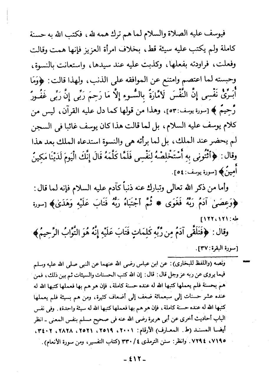 فَيُوسُفُ - عَلَيْهِ الصَّلَاةُ وَالسَّلَامُ - لَمَّا هَمَّ تَرَكَ هَمَّهُ لِلَّهِ، فَكَتَبَ اللَّهُ بِهِ حَسَنَةً كَامِلَةً وَلَمْ يَكْتُبْ عَلَيْهِ سَيِّئَةً قَطُّ، بِخِلَافِ امْرَأَةِ الْعَزِيزِ فَإِنَّهَا هَمَّتْ وَقَالَتْ وَفَعَلَتْ، فَرَاوَدَتْهُ بِفِعْلِهَا وَكَذَبَتْ عَلَيْهِ عِنْدَ سَيِّدِهَا وَاسْتَعَانَتْ بِالنِّسْوَةِ، وَحَبَسَتْهُ لَمَّا اعْتَصَمَ وَامْتَنَعَ عَنِ الْمُوَافَقَةِ عَلَى الذَّنْبِ وَلِهَذَا قَالَتْ: {وَمَا أُبَرِّئُ نَفْسِي إِنَّ النَّفْسَ لَأَمَّارَةٌ بِالسُّوءِ إِلَّا مَا رَحِمَ رَبِّي إِنَّ رَبِّي غَفُورٌ رَحِيمٌ} [سُورَةُ يُوسُفَ: 53] ، وَهَذَا مِنْ قَوْلِهَا كَمَا دَلَّ عَلَيْهِ الْقُرْآنُ، لَيْسَ مِنْ كَلَامِ يُوسُفَ عَلَيْهِ السَّلَامُ، بَلْ لَمَّا قَالَتْ هَذَا كَانَ يُوسُفُ غَائِبًا فِي السِّجْنِ لَمْ يَحْضُرْ عِنْدَ الْمَلِكِ، بَلْ لَمَّا بَرَّأَتْهُ هِيَ وَالنِّسْوَةُ اسْتَدْعَاهُ الْمَلِكُ بَعْدَ هَذَا وَقَالَ: {ائْتُونِي بِهِ أَسْتَخْلِصْهُ لِنَفْسِي فَلَمَّا كَلَّمَهُ قَالَ إِنَّكَ الْيَوْمَ لَدَيْنَا مَكِينٌ أَمِينٌ} [سُورَةُ يُوسُفَ: 54] . وَأَمَّا مَنْ ذَكَرَ اللَّهُ تَعَالَى وَتَبَارَكَ عَنْهُ ذَنْبًا كَآدَمَ عَلَيْهِ السَّلَامُ فَإِنَّهُ لَمَّا قَالَ: {وَعَصَى آدَمُ رَبَّهُ فَغَوَى - ثُمَّ اجْتَبَاهُ رَبُّهُ فَتَابَ عَلَيْهِ وَهَدَى} [سُورَةُ طَه: 121، 122] وَقَالَ: {فَتَلَقَّى آدَمُ مِنْ رَبِّهِ كَلِمَاتٍ فَتَابَ عَلَيْهِ إِنَّهُ هُوَ التَّوَّابُ الرَّحِيمُ} [سُورَةُ الْبَقَرَةِ: 37] .