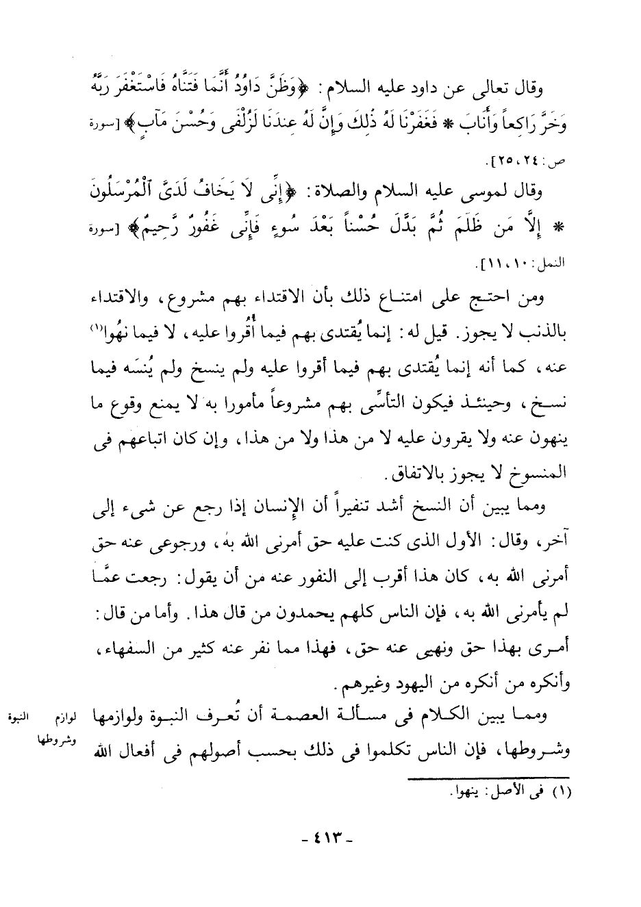 وَقَالَ تَعَالَى عَنْ دَاوُدَ عَلَيْهِ السَّلَامُ: {وَظَنَّ دَاوُدُ أَنَّمَا فَتَنَّاهُ فَاسْتَغْفَرَ رَبَّهُ وَخَرَّ رَاكِعًا وَأَنَابَ - فَغَفَرْنَا لَهُ ذَلِكَ وَإِنَّ لَهُ عِنْدَنَا لَزُلْفَى وَحُسْنَ مَآبٍ} [سُورَةُ ص: 24، 25] . وَقَالَ لِمُوسَى عَلَيْهِ السَّلَامُ وَالصَّلَاةُ: {إِنِّي لَا يَخَافُ لَدَيَّ الْمُرْسَلُونَ - إِلَّا مَنْ ظَلَمَ ثُمَّ بَدَّلَ حُسْنًا بَعْدَ سُوءٍ فَإِنِّي غَفُورٌ رَحِيمٌ} [سُورَةُ النَّمْلِ: 10، 11] وَمَنِ احْتَجَّ عَلَى امْتِنَاعِ ذَلِكَ بِأَنَّ الِاقْتِدَاءَ بِهِمْ مَشْرُوعٌ، وَالِاقْتِدَاءُ بِالذَّنْبِ لَا يَجُوزُ. قِيلَ لَهُ: إِنَّمَا يُقْتَدَى بِهِمْ فِيمَا أُقِرُّوا عَلَيْهِ، لَا فِيمَا نُهُوا (¬1) . عَنْهُ، كَمَا أَنَّهُ إِنَّمَا يُقْتَدَى بِهِمْ فِيمَا أُقِرُّوا عَلَيْهِ وَلَمْ يُنْسَخْ وَلَمْ يُنْسَهُ فِيمَا نُسِخَ، وَحِينَئِذٍ فَيَكُونُ التَّأَسِّي بِهِمْ مَشْرُوعًا مَأْمُورًا بِهِ لَا يَمْنَعُ وُقُوعَ مَا يُنْهَوْنَ عَنْهُ وَلَا يُقَرُّونَ عَلَيْهِ لَا مِنْ هَذَا وَلَا مِنْ هَذَا، وَإِنْ كَانَ اتِّبَاعُهُمْ فِي الْمَنْسُوخِ لَا يَجُوزُ بِالِاتِّفَاقِ. وَمِمَّا يُبَيِّنُ أَنَّ النَّسْخَ أَشَدُّ تَنْفِيرًا أَنَّ الْإِنْسَانَ إِذَا رَجَعَ عَنْ شَيْءٍ إِلَى آخَرَ، وَقَالَ: الْأَوَّلُ الَّذِي كُنْتُ عَلَيْهِ حَقٌّ أَمَرَنِي اللَّهُ بِهِ، وَرُجُوعِي عَنْهُ حَقٌّ أَمَرَنِي اللَّهُ بِهِ، كَانَ هَذَا أَقْرَبَ إِلَى النُّفُورِ عَنْهُ مِنْ أَنْ يَقُولَ: رَجَعْتُ عَمَّا لَمْ يَأْمُرْنِي اللَّهُ بِهِ، فَإِنَّ النَّاسَ كُلَّهُمْ يَحْمَدُونَ مَنْ قَالَ هَذَا. وَأَمَّا مَنْ قَالَ: أَمْرِي بِهَذَا حَقٌّ وَنَهْيِي عَنْهُ حَقٌّ، فَهَذَا مِمَّا نَفَرَ عَنْهُ كَثِيرٌ مِنَ السُّفَهَاءِ، وَأَنْكَرَهُ مَنْ أَنْكَرَهُ مِنَ الْيَهُودِ وَغَيْرِهِمْ.