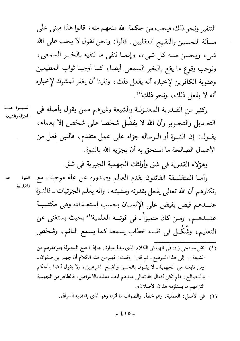 (¬1) نَقَلَ مُسْتَجِي زَادَهْ فِي الْهَامِشِ الْكَلَامَ الَّذِي يَبْدَأُ بِعِبَارَةِ: " وَإِذَا احْتَجَّ الْمُعْتَزِلَةُ وَمُوَافِقُوهُمْ مِنَ الشِّيعَةِ. . إِلَى هَذَا الْمَوْضِعِ، ثُمَّ قَالَ: " قُلْتُ: فَهُمْ مِنْ هَذَا الْكَلَامِ أَنَّ جَهْمَ بْنَ صَفْوَانَ - وَمَنْ تَابَعَهُ مِنَ الْجَهْمِيَّةِ - لَا يَقُولُ بِالْحُسْنِ وَالْقُبْحِ الشَّرْعِيَّيْنِ، وَلَا يَقُولُ أَيْضًا بِالْحِكَمِ وَالْمَصَالِحِ، فَلَمْ تَكُنْ أَفْعَالُ اللَّهِ تَعَالَى عِنْدَهُمْ أَيْضًا مُعَلَّلَةً بِالْأَغْرَاضِ، فَالظَّاهِرُ مِنَ الْجَهْمِيَّةِ الْتِزَامُهُمْ مَا يَسْتَلْزِمُهُ هَذَانِ الْأَصْلَانِ