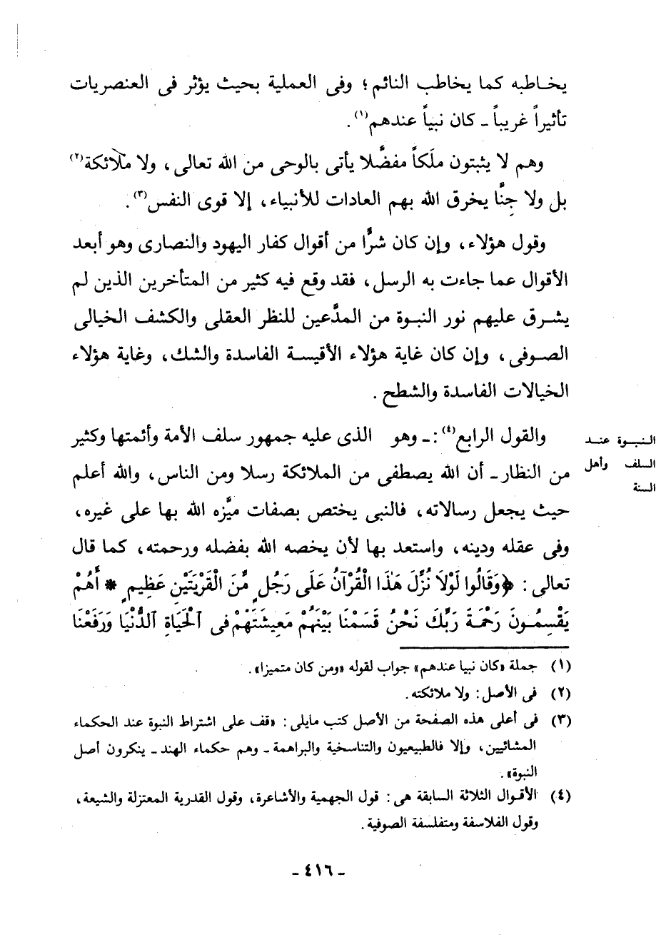 (¬3) فِي أَعْلَى هَذِهِ الصَّفْحَةِ مِنَ الْأَصْلِ كُتِبَ مَا يَلِي: " قِفْ عَلَى اشْتِرَاطِ النُّبُوَّةِ عِنْدَ الْحُكَمَاءِ الْمَشَّائِيِينَ، وَإِلَّا فَالطَّبِيعِيُّونَ وَالتَّنَاسُخِيَّةُ وَالْبَرَاهِمَةُ - وَهُمْ حُكَمَاءُ الْهِنْدِ - يُنْكِرُونَ أَصْلَ النُّبُوَّةِ