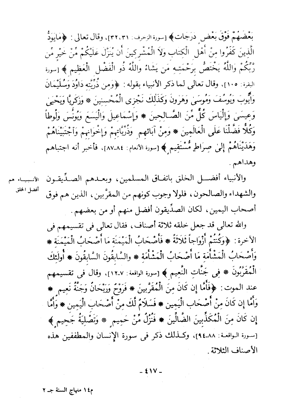 وَالْأَنْبِيَاءُ أَفْضَلُ الْخَلْقِ بِاتِّفَاقِ الْمُسْلِمِينَ، وَبَعْدَهُمُ الصِّدِّيقُونَ وَالشُّهَدَاءُ وَالصَّالِحُونَ فَلَوْلَا وُجُوبُ كَوْنِهِمْ مِنَ الْمُقَرَّبِينَ، الَّذِينَ هُمْ فَوْقَ أَصْحَابِ الْيَمِينِ، لَكَانَ الصِّدِّيقُونَ أَفْضَلَ مِنْهُمْ، أَوْ مِنْ بَعْضِهِمْ.