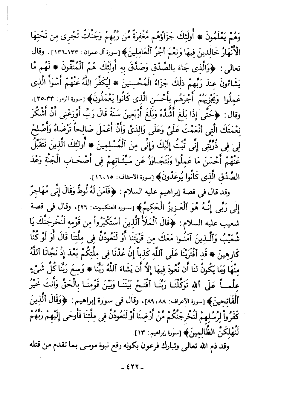 وَقَالَ تَعَالَى: {وَالَّذِي جَاءَ بِالصِّدْقِ وَصَدَّقَ بِهِ أُولَئِكَ هُمُ الْمُتَّقُونَ - لَهُمْ مَا يَشَاءُونَ عِنْدَ رَبِّهِمْ ذَلِكَ جَزَاءُ الْمُحْسِنِينَ - لِيُكَفِّرَ اللَّهُ عَنْهُمْ أَسْوَأَ الَّذِي عَمِلُوا وَيَجْزِيَهُمْ أَجْرَهُمْ بِأَحْسَنِ الَّذِي كَانُوا يَعْمَلُونَ} [سُورَةُ الزُّمَرِ: 33 - 35] . وَقَالَ: {حَتَّى إِذَا بَلَغَ أَشُدَّهُ وَبَلَغَ أَرْبَعِينَ سَنَةً قَالَ رَبِّ أَوْزِعْنِي أَنْ أَشْكُرَ نِعْمَتَكَ الَّتِي أَنْعَمْتَ عَلَيَّ وَعَلَى وَالِدَيَّ وَأَنْ أَعْمَلَ صَالِحًا تَرْضَاهُ وَأَصْلِحْ لِي فِي ذُرِّيَّتِي إِنِّي تُبْتُ إِلَيْكَ وَإِنِّي مِنَ الْمُسْلِمِينَ - أُولَئِكَ الَّذِينَ نَتَقَبَّلُ عَنْهُمْ أَحْسَنَ مَا عَمِلُوا وَنَتَجاوَزُ عَنْ سَيِّئَاتِهِمْ فِي أَصْحَابِ الْجَنَّةِ وَعْدَ الصِّدْقِ الَّذِي كَانُوا يُوعَدُونَ} [سُورَةُ الْأَحْقَافِ: 15، 16] .