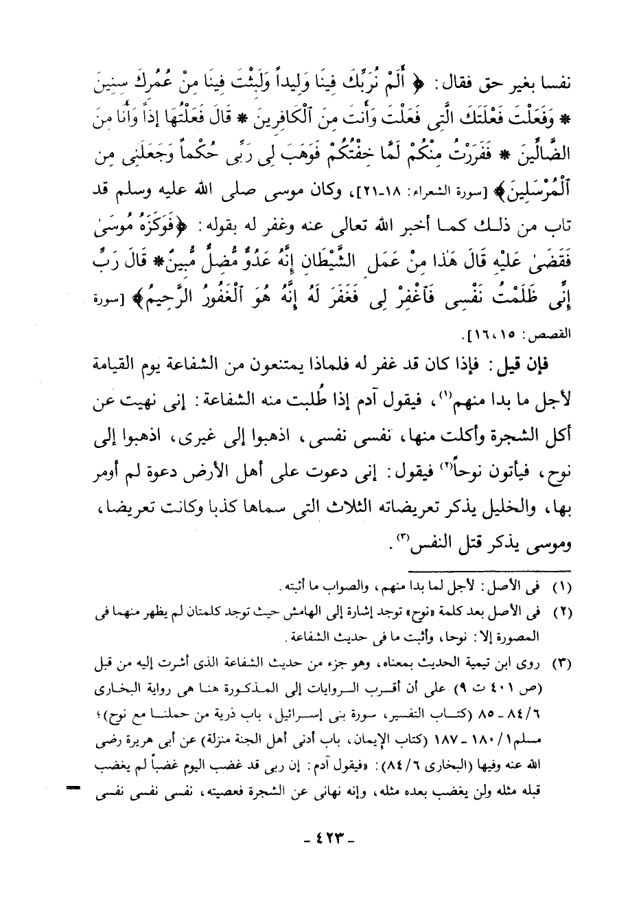 (¬3) رَوَى ابْنُ تَيْمِيَّةَ الْحَدِيثَ بِمَعْنَاهُ، وَهُوَ جُزْءٌ مِنْ حَدِيثِ الشَّفَاعَةِ الَّذِي أَشَرْتُ إِلَيْهِ مِنْ قَبْلُ (ص 401 ت 9) عَلَى أَنَّ أَقْرَبَ الرِّوَايَاتِ إِلَى الْمَذْكُورَةِ هُنَا هِيَ رِوَايَةُ الْبُخَارِيِّ 6/84 - 85 (كِتَابُ التَّفْسِيرِ، سُورَةُ بَنِي إِسْرَائِيلَ، بَابُ ذُرِّيَّةِ مَنْ حَمَلْنَا مَعَ نُوحٍ) ; مُسْلِمٍ 1/180 - 187 (كِتَابُ الْإِيمَانِ، بَابُ أَدْنَى أَهْلِ الْجَنَّةِ مَنْزِلَةً) عَنْ أَبِي هُرَيْرَةَ رَضِيَ اللَّهُ عَنْهُ وَفِيهَا (الْبُخَارِيِّ 6/84) : " فَيَقُولُ آدَمُ: إِنَّ رَبِّي قَدْ غَضِبَ الْيَوْمَ غَضَبًا لَمْ يَغْضَبْ قَبْلَهُ مِثْلَهُ وَلَنْ يَغْضَبَ بَعْدَهُ مِثْلَهُ، وَإِنَّهُ نَهَانِي عَنِ الشَّجَرَةِ فَعَصَيْتُهُ، نَفْسِي نَفْسِي نَفْسِي اذْهَبُوا إِلَى غَيْرِي، اذْهَبُوا إِلَى نُوحٍ، فَيَأْتُونَ نُوحًا فَيَقُولُونَ: يَا نُوحُ إِنَّكَ أَوَّلُ الرُّسُلِ إِلَى أَهْلِ الْأَرْضِ وَقَدْ سَمَّاكَ اللَّهُ عَبْدًا شَكُورًا، اشْفَعْ لَنَا إِلَى رَبِّكَ، أَلَا تَرَى إِلَى مَا نَحْنُ فِيهِ، فَيَقُولُ: إِنَّ رَبِّي عَزَّ وَجَلَّ قَدْ غَضِبَ الْيَوْمَ غَضَبًا لَمْ يَغْضَبْ قَبْلَهُ مِثْلَهُ وَلَنْ يَغْضَبَ بَعْدَهُ مِثْلَهُ، وَإِنَّهُ قَدْ كَانَتْ لِي دَعْوَةٌ دَعَوْتُهَا عَلَى قَوْمِي، نَفْسِي نَفْسِي نَفْسِي، اذْهَبُوا إِلَى إِبْرَاهِيمَ ; فَيَأْتُونَ إِبْرَاهِيمَ فَيَقُولُونَ: يَا إِبْرَاهِيمُ أَنْتَ نَبِيُّ اللَّهِ وَخَلِيلُهُ مِنْ أَهْلِ الْأَرْضِ اشْفَعْ لَنَا إِلَى رَبِّكَ، أَلَا تَرَى إِلَى مَا نَحْنُ فِيهِ فَيَقُولُ لَهُمْ: إِنَّ رَبِّي قَدْ غَضِبَ الْيَوْمَ غَضَبًا لَمْ يَغْضَبْ قَبْلَهُ مِثْلَهُ وَلَنْ يَغْضَبَ بَعْدَهُ مِثْلَهُ، وَإِنِّي قَدْ كُنْتُ كَذَبْتُ ثَلَاثَ كِذْبَاتٍ - فَذَكَرَهُنَّ أَبُو حَيَّانَ فِي الْحَدِيثِ - نَفْسِي نَفْسِي نَفْسِي اذْهَبُوا إِلَى غَيْرِي، اذْهَبُوا إِلَى مُوسَى ; فَيَأْتُونَ مُوسَى فَيَقُولُونَ: يَا مُوسَى أَنْتَ رَسُولُ اللَّهِ فَضَّلَكَ اللَّهُ بِرِسَالَتِهِ وَبِكَلَامِهِ عَلَى النَّاسِ، اشْفَعْ لَنَا إِلَى رَبِّكَ، أَلَا تَرَى إِلَى مَا نَحْنُ فِيهِ، فَيَقُولُ: إِنَّ رَبِّي قَدْ غَضِبَ الْيَوْمَ غَضَبًا لَمْ يَغْضَبْ قَبْلَهُ مِثْلَهُ وَلَنْ يَغْضَبَ بَعْدَهُ مِثْلَهُ، وَإِنِّي قَدْ قَتَلْتُ نَفْسًا لَمْ أُومَرْ بِقَتْلِهَا، نَفْسِي نَفْسِي نَفْسِي، اذْهَبُوا إِلَى غَيْرِي، اذْهَبُوا إِلَى عِيسَى ; فَيَأْتُونَ عِيسَى فَيَقُولُونَ: يَا عِيسَى أَنْتَ رَسُولُ اللَّهِ وَكَلِمَتُهُ أَلْقَاهَا إِلَى مَرْيَمَ وَرُوحٌ مِنْهُ وَكَلَّمْتَ النَّاسَ فِي الْمَهْدِ صَبِيًّا، اشْفَعْ لَنَا، أَلَا تَرَى إِلَى مَا نَحْنُ فِيهِ، فَيَقُولُ عِيسَى: إِنَّ رَبِّي قَدْ غَضِبَ الْيَوْمَ غَضَبًا لَمْ يَغْضَبْ قَبْلَهُ مِثْلَهُ وَلَنْ يَغْضَبَ بَعْدَهُ مِثْلَهُ - وَلَمْ يَذْكُرْ ذَنْبًا - نَفْسِي نَفْسِي نَفْسِي، اذْهَبُوا إِلَى غَيْرِي، اذْهَبُوا إِلَى مُحَمَّدٍ صَلَّى اللَّهُ عَلَيْهِ وَسَلَّمَ ; فَيَأْتُونَ مُحَمَّدًا صَلَّى اللَّهُ عَلَيْهِ وَسَلَّمَ، فَيَقُولُونَ: يَا مُحَمَّدُ، أَنْتَ رَسُولُ اللَّهِ وَخَاتَمُ الْأَنْبِيَاءِ وَقَدْ غَفَرَ اللَّهُ لَكَ مَا تَقَدَّمَ مِنْ ذَنْبِكَ وَمَا تَأَخَّرَ، اشْفَعْ لَنَا إِلَى رَبِّكَ، أَلَا تَرَى إِلَى مَا نَحْنُ فِيهِ، فَأَنْطَلِقُ فَآتِي تَحْتَ الْعَرْشِ فَأَقَعُ سَاجِدًا لِرَبِّي عَزَّ وَجَلَّ ; ثُمَّ يَفْتَحُ اللَّهُ عَلَيَّ مِنْ مَحَامِدِهِ وَحُسْنِ الثَّنَاءِ عَلَيْهِ شَيْئًا لَمْ يَفْتَحْهُ عَلَى أَحَدٍ قَبْلِي، ثُمَّ يُقَالُ يَا مُحَمَّدُ ارْفَعْ رَأْسَكَ، سَلْ تُعْطَهْ، وَاشْفَعْ تُشَفَّعْ، فَأَرْفَعُ رَأْسِي فَأَقُولُ: أُمَّتِي يَا رَبِّ أُمَّتِي يَا ر