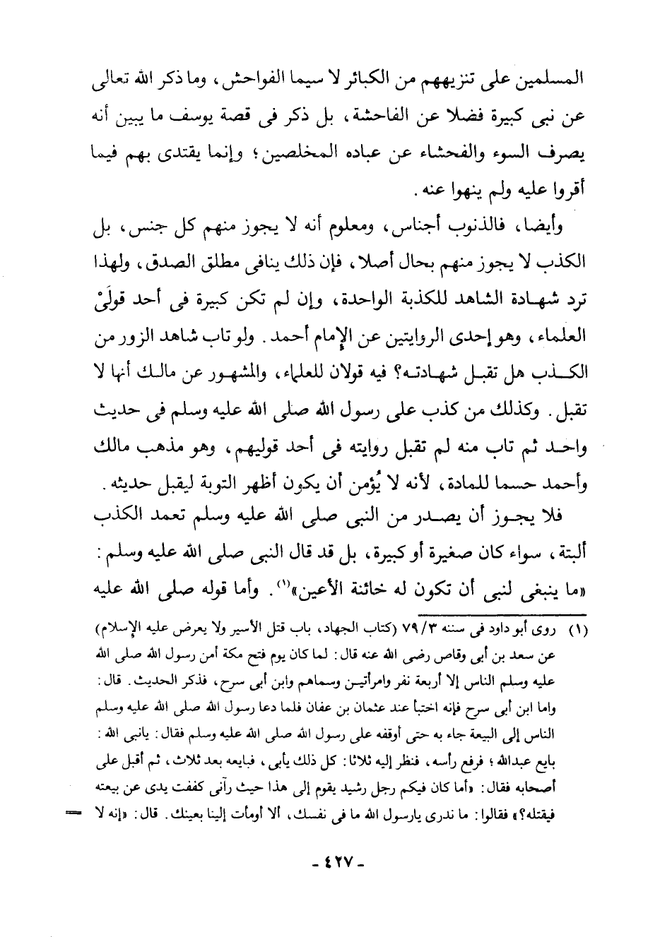وَأَيْضًا، فَالذُّنُوبُ أَجْنَاسٌ، وَمَعْلُومٌ أَنَّهُ لَا يَجُوزُ مِنْهُمْ كُلُّ جِنْسٍ، بَلِ الْكَذِبُ لَا يَجُوزُ مِنْهُمْ بِحَالٍ أَصْلًا، فَإِنَّ ذَلِكَ يُنَافِي مُطْلَقَ الصِّدْقِ، وَلِهَذَا تُرَدُّ شَهَادَةُ الشَّاهِدِ لِلْكِذْبَةِ الْوَاحِدَةِ، وَإِنْ لَمْ تَكُنْ كَبِيرَةً فِي أَحَدِ قَوْلَيِ الْعُلَمَاءِ، وَهُوَ إِحْدَى الرِّوَايَتَيْنِ عَنِ الْإِمَامِ أَحْمَدَ. وَلَوْ تَابَ شَاهِدُ الزُّورِ مِنَ الْكَذِبِ هَلْ تُقْبَلُ شَهَادَتُهُ؟ فِيهِ قَوْلَانِ لِلْعُلَمَاءِ، وَالْمَشْهُورُ عَنْ مَالِكٍ أَنَّهَا لَا تُقْبَلُ. وَكَذَلِكَ مَنْ كَذَبَ عَلَى رَسُولِ اللَّهِ - صَلَّى اللَّهُ عَلَيْهِ وَسَلَّمَ - فِي حَدِيثٍ وَاحِدٍ ثُمَّ تَابَ مِنْهُ لَمْ تُقْبَلْ رِوَايَتُهُ فِي أَحَدِ قَوْلَيْهِمْ، وَهُوَ مَذْهَبُ مَالِكٍ وَأَحْمَدَ حَسْمًا لِلْمَادَّةِ، لِأَنَّهُ لَا يُؤْمَنُ أَنْ يَكُونَ أَظْهَرَ التَّوْبَةَ لِيُقْبَلَ حَدِيثُهُ.