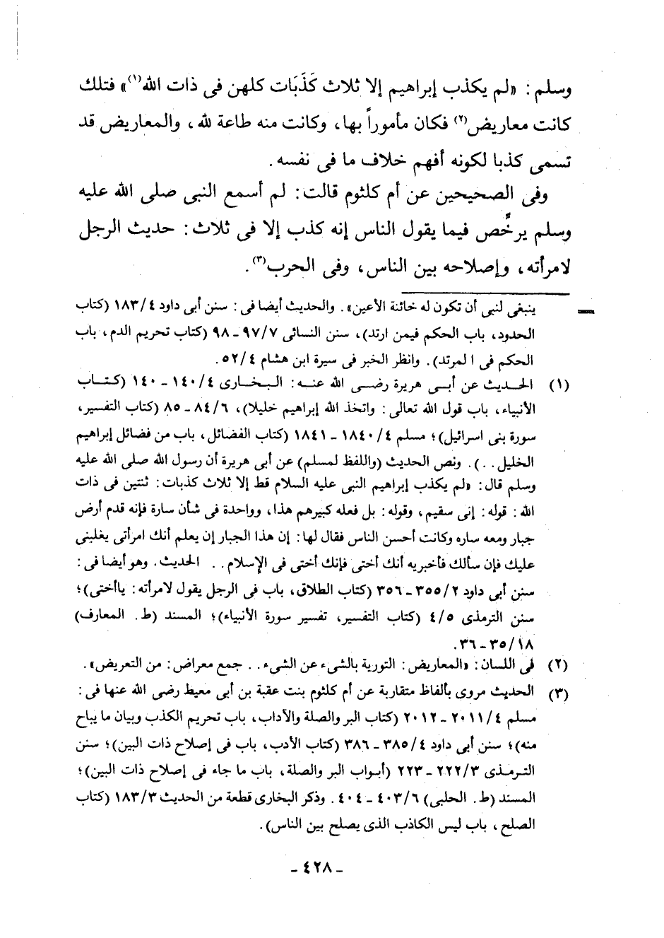 (¬1) الْحَدِيثُ عَنْ أَبِي هُرَيْرَةَ رَضِيَ اللَّهُ عَنْهُ: الْبُخَارِيِّ 4/140 - 140 (كِتَابُ الْأَنْبِيَاءِ، بَابُ قَوْلِ اللَّهِ تَعَالَى: وَاتَّخَذَ اللَّهُ إِبْرَاهِيمَ خَلِيلًا) ، 6/84 - 85 (كِتَابُ التَّفْسِيرِ، سُورَةُ بَنِي إِسْرَائِيلَ) ; مُسْلِمٍ 4/1840 - 1841 (كِتَابُ الْفَضَائِلِ، بَابُ مِنْ فَضَائِلِ إِبْرَاهِيمَ الْخَلِيلِ. .) وَنَصُّ الْحَدِيثِ (وَاللَّفْظُ لِمُسْلِمٍ) عَنْ أَبِي هُرَيْرَةَ أَنَّ رَسُولَ اللَّهِ صَلَّى اللَّهُ عَلَيْهِ وَسَلَّمَ قَالَ: " لَمْ يَكْذِبْ إِبْرَاهِيمُ النَّبِيُّ عَلَيْهِ السَّلَامُ قَطُّ إِلَّا ثَلَاثَ كِذْبَاتٍ: ثِنْتَيْنِ فِي ذَاتِ اللَّهِ: قَوْلُهُ: إِنِّي سَقِيمٌ، وَقَوْلُهُ: بَلْ فَعَلَهُ كَبِيرُهُمْ هَذَا، وَوَاحِدَةٌ فِي شَأْنِ سَارَّةَ فَإِنَّهُ قَدِمَ أَرْضَ جَبَّارٍ وَمَعَهُ سَارَّةُ وَكَانَتْ أَحْسَنَ النَّاسِ فَقَالَ لَهَا: إِنَّ هَذَا الْجَبَّارَ إِنْ يَعْلَمْ أَنَّكِ امْرَأَتِي يَغْلِبْنِي عَلَيْكِ فَإِنْ سَأَلَكِ فَأَخْبِرِيهِ أَنَّكِ أُخْتِي فَإِنَّكِ أُخْتِي فِي الْإِسْلَامِ. . الْحَدِيثَ. وَهُوَ أَيْضًا فِي: سُنَنِ أَبِي دَاوُدَ 2/355 - 356 (كِتَابُ الطَّلَاقِ، بَابُ فِي الرَّجُلِ يَقُولُ لِامْرَأَتِهِ: يَا أُخْتِي) ; سُنَنِ التِّرْمِذِيِّ 5/4 (كِتَابُ التَّفْسِيرِ، سُورَةُ الْأَنْبِيَاءِ) ; الْمُسْنَدِ (ط. الْمَعَارِفِ) 18/35 - 36