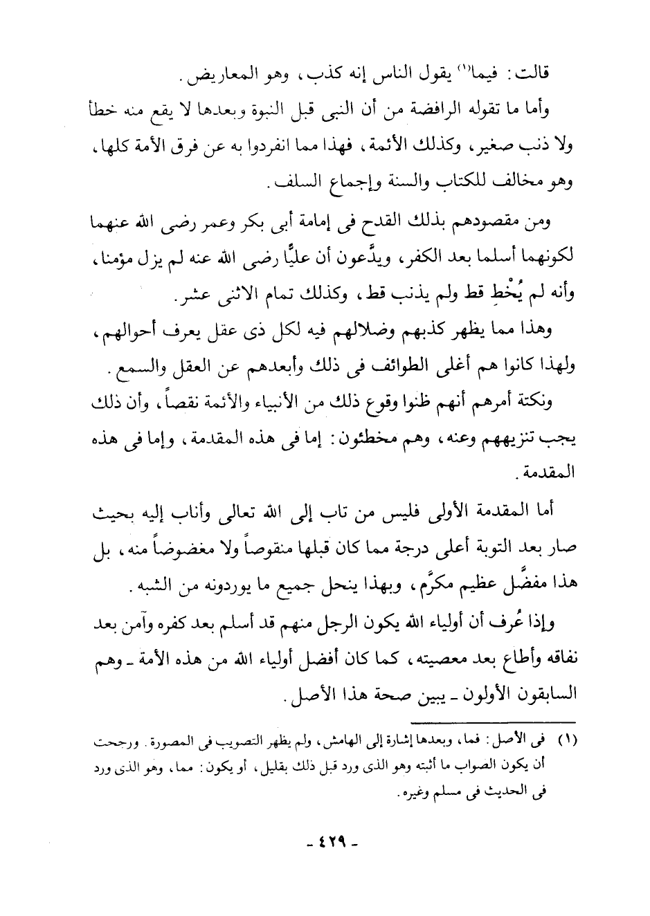وَأَمَّا مَا تَقَوَّلَهُ الرَّافِضَةُ مِنْ أَنَّ النَّبِيَّ قَبْلَ النُّبُوَّةِ وَبَعْدَهَا لَا يَقَعُ مِنْهُ خَطَأٌ وَلَا ذَنْبٌ صَغِيرٌ، وَكَذَلِكَ الْأَئِمَّةُ، فَهَذَا مِمَّا انْفَرَدُوا بِهِ عَنْ فِرَقِ الْأُمَّةِ كُلِّهَا، وَهُوَ مُخَالِفٌ لِلْكِتَابِ وَالسُّنَّةِ وَإِجْمَاعِ السَّلَفِ.