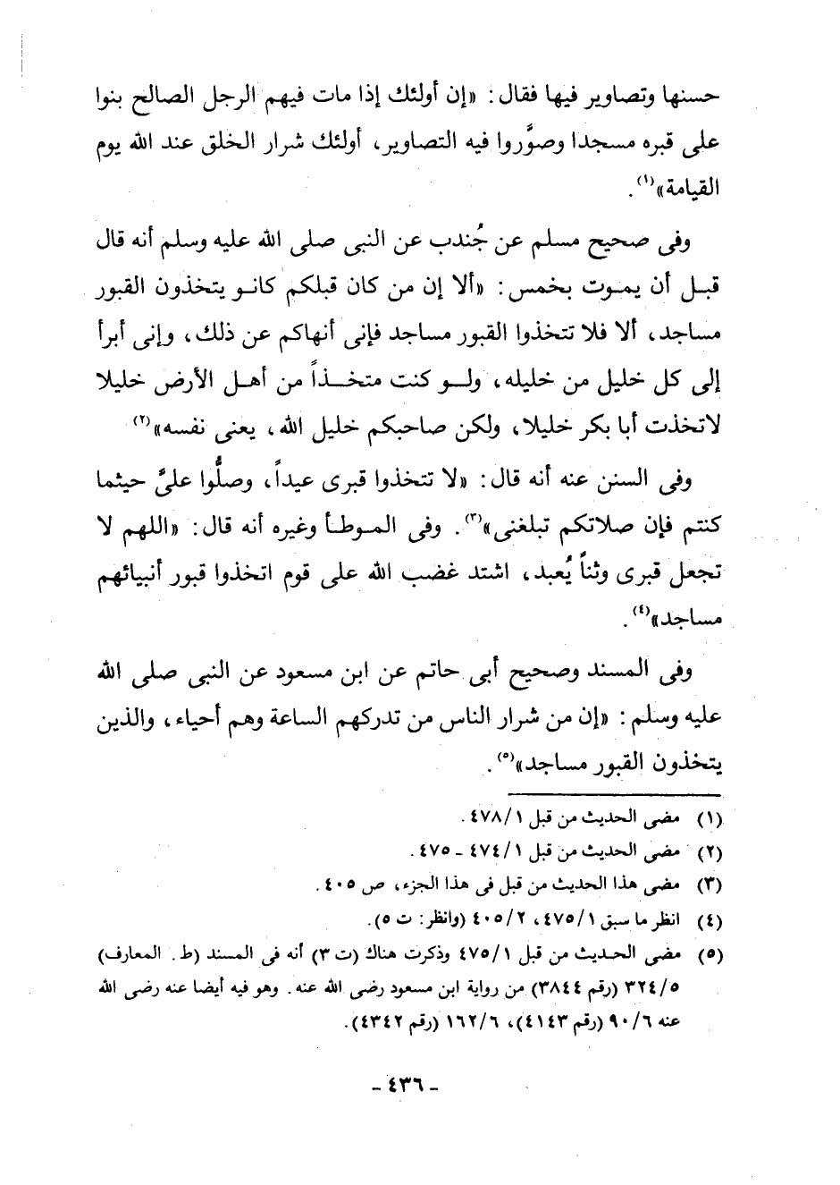وَفِي الْمُسْنَدِ وَصَحِيحِ أَبِي حَاتِمٍ عَنِ ابْنِ مَسْعُودٍ عَنِ النَّبِيِّ - صَلَّى اللَّهُ عَلَيْهِ وَسَلَّمَ -: " «إِنَّ مِنْ شِرَارِ النَّاسِ مَنْ تُدْرِكُهُمُ السَّاعَةُ وَهُمْ أَحْيَاءٌ، وَالَّذِينَ يَتَّخِذُونَ الْقُبُورَ مَسَاجِدَ» " (¬5)) . .