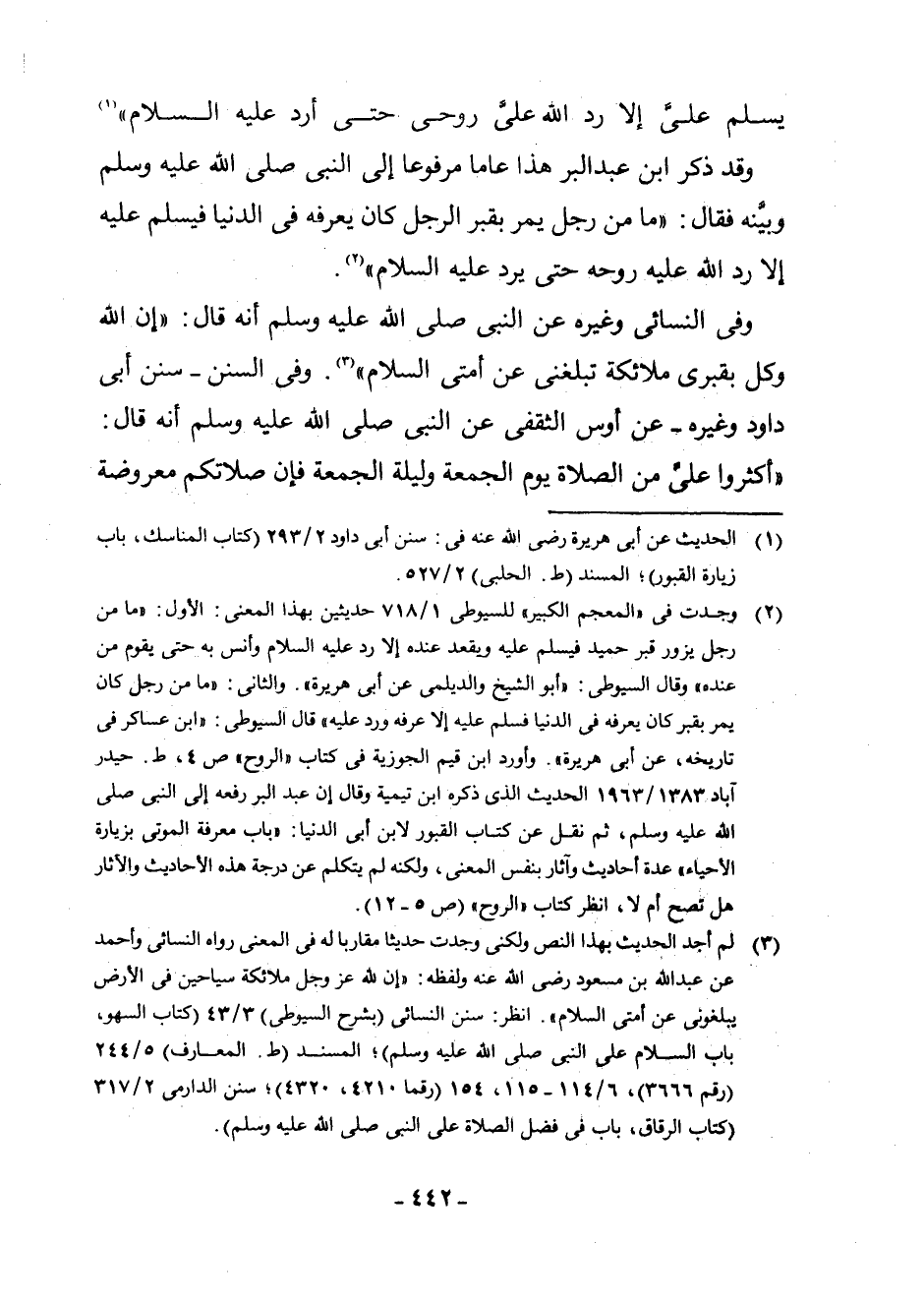 (¬2) وَجَدْتُ فِي " الْمُعْجَمِ الْكَبِيرِ " لِلسُّيُوطِيِّ 1/718 حَدِيثَيْنِ بِهَذَا الْمَعْنَى: الْأَوَّلُ: " مَا مِنْ رَجُلٍ يَزُورُ قَبْرَ حُمَيْدٍ فَيُسَلِّمُ عَلَيْهِ وَيَقْعُدُ عِنْدَهُ إِلَّا رَدَّ عَلَيْهِ السَّلَامَ وَأَنِسَ بِهِ حَتَّى يَقُومَ مِنْ عِنْدِهِ " وَقَالَ السُّيُوطِيُّ: " أَبُو الشَّيْخِ وَالدَّيْلَمِيُّ عَنْ أَبِي هُرَيْرَةَ ". وَالثَّانِي: " مَا مِنْ رَجُلٍ كَانَ يَمُرُّ بِقَبْرٍ كَانَ يَعْرِفُهُ فِي الدُّنْيَا فَسَلَّمَ عَلَيْهِ إِلَّا عَرَفَهُ وَرَدَّ عَلَيْهِ " قَالَ السُّيُوطِيُّ: " ابْنُ عَسَاكِرَ فِي تَارِيخِهِ، عَنْ أَبِي هُرَيْرَةَ ". وَأَوْرَدَ ابْنُ قَيِّمِ الْجَوْزِيَّةِ فِي كِتَابِ " الرُّوحِ " ص 4، ط. حَيْدَرَ آبَادَ 1383/1963 الْحَدِيثُ الَّذِي ذَكَرَهُ ابْنُ تَيْمِيَّةَ وَقَالَ إِنَّ عَبْدَ الْبَرِّ رَفَعَهُ إِلَى النَّبِيِّ صَلَّى اللَّهُ عَلَيْهِ وَسَلَّمَ، ثُمَّ نَقَلَ عَنْ كِتَابِ الْقُبُورِ لِابْنِ أَبِي الدُّنْيَا: " بَابُ مَعْرِفَةِ الْمَوْتَى بِزِيَادَةِ الْأَحْيَاءِ " عِدَّةَ أَحَادِيثَ وَآثَارٍ بِنَفْسِ الْمَعْنَى، وَلَكِنَّهُ لَمْ يَتَكَلَّمْ عَنْ دَرَجَةِ هَذِهِ الْأَحَادِيثِ وَالْآثَارِ هَلْ تَصِحُّ أَمْ لَا، انْظُرْ كِتَابَ " الرُّوحِ " (ص [0 - 9]- 12)