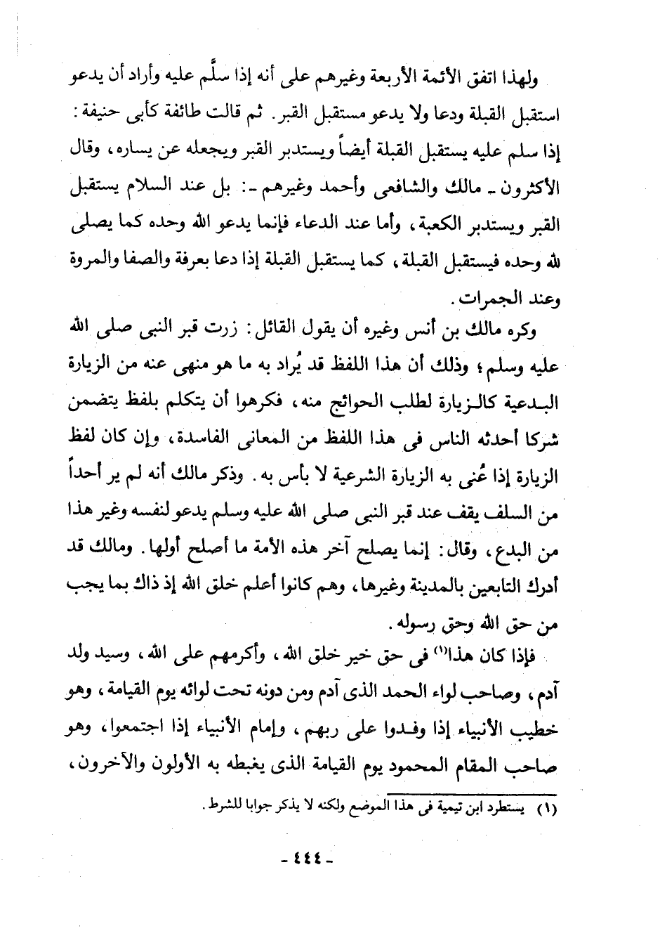 وَكَرِهَ مَالِكُ بْنُ أَنَسٍ وَغَيْرُهُ أَنْ يَقُولَ الْقَائِلُ: زُرْتُ قَبْرَ النَّبِيِّ - صَلَّى اللَّهُ عَلَيْهِ وَسَلَّمَ - وَذَلِكَ أَنَّ هَذَا اللَّفْظَ قَدْ يُرَادُ بِهِ مَا هُوَ مَنْهِيٌّ عَنْهُ مِنَ الزِّيَارَةِ الْبِدْعِيَّةِ كَالزِّيَارَةِ لِطَلَبِ الْحَوَائِجِ مِنْهُ، فَكَرِهُوا أَنْ يَتَكَلَّمَ بِلَفْظٍ يَتَضَمَّنُ شِرْكًا أَحْدَثَهُ النَّاسُ فِي هَذَا اللَّفْظِ مِنَ الْمَعَانِي الْفَاسِدَةِ، وَإِنْ كَانَ لَفْظُ الزِّيَارَةِ إِذَا عُنِيَ بِهِ الزِّيَارَةُ الشَّرْعِيَّةُ لَا بَأْسَ بِهِ. وَذَكَرَ مَالِكٌ أَنَّهُ لَمْ يَرَ أَحَدًا مِنَ السَّلَفِ يَقِفُ عِنْدَ قَبْرِ النَّبِيِّ - صَلَّى اللَّهُ عَلَيْهِ وَسَلَّمَ - يَدْعُو لِنَفْسِهِ وَغَيْرُ هَذَا مِنَ الْبِدَعِ، وَقَالَ: إِنَّمَا يُصْلِحُ آخِرَ هَذِهِ الْأُمَّةِ مَا أَصْلَحَ أَوَّلَهَا. وَمَالِكٌ قَدْ أَدْرَكَ التَّابِعِينَ بِالْمَدِينَةِ وَغَيْرِهَا، وَهُمْ كَانُوا أَعْلَمَ خَلْقِ اللَّهِ إِذْ ذَاكَ بِمَا يَجِبُ مِنْ حَقِّ اللَّهِ وَحَقِّ رَسُولِهِ.