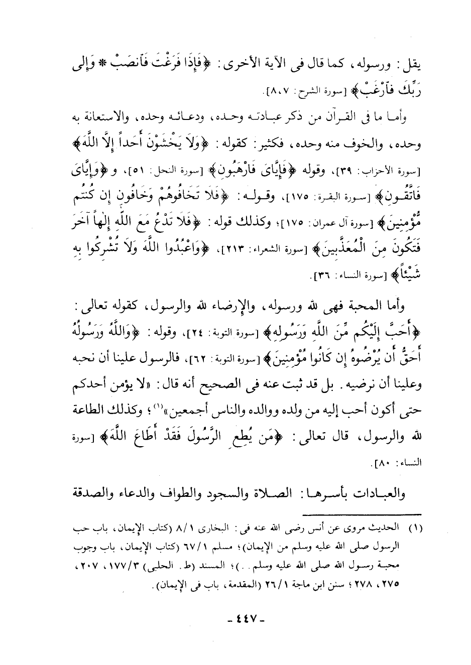 وَأَمَّا مَا فِي الْقُرْآنِ مِنْ ذِكْرِ عِبَادَتِهِ وَحْدَهُ، وَدُعَائِهِ وَحْدَهُ، وَالِاسْتِعَانَةِ بِهِ وَحْدَهُ، وَالْخَوْفِ مِنْهُ وَحْدَهُ، فَكَثِيرٌ كَقَوْلِهِ: {وَلَا يَخْشَوْنَ أَحَدًا إِلَّا اللَّهَ} [سُورَةُ الْأَحْزَابِ: 39] ، وَقَوْلِهِ: {فَإِيَّايَ فَارْهَبُونِ} [سُورَةُ النَّحْلِ: 51] ، وَ {وَإِيَّايَ فَاتَّقُونِ} [سُورَةُ الْبَقَرَةِ: 175] ، وَقَوْلِهِ: {فَلَا تَخَافُوهُمْ وَخَافُونِ إِنْ كُنْتُمْ مُؤْمِنِينَ} [سُورَةُ آلِ عِمْرَانَ: 175] ، وَكَذَلِكَ قَوْلُهُ: {فَلَا تَدْعُ مَعَ اللَّهِ إِلَهًا آخَرَ فَتَكُونَ مِنَ الْمُعَذَّبِينَ} [سُورَةُ الشُّعَرَاءِ: 213] ، {وَاعْبُدُوا اللَّهَ وَلَا تُشْرِكُوا بِهِ شَيْئًا} [سُورَةُ النِّسَاءِ: 36] .