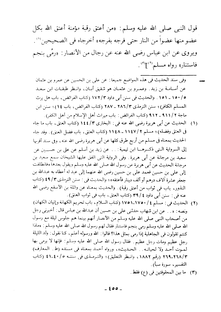 (¬1) الْحَدِيثُ عَنْ أَبِي هُرَيْرَةَ رَضِيَ اللَّهُ عَنْهُ فِي: الْبُخَارِيِّ 3/144 (كِتَابُ الْعِتْقِ، بَابُ مَا جَاءَ فِي الْعِتْقِ وَفَضْلِهِ) ; مُسْلِمٍ 2/1147 - 1148 (كِتَابُ الْعِتْقِ، بَابُ فَضْلِ الْعِتْقِ) . وَقَدْ جَاءَ الْحَدِيثُ بِمَعْنَاهُ فِي مُسْلِمٍ مِنْ أَرْبَعِ طُرُقٍ كُلِّهَا عَنْ أَبِي هُرَيْرَةَ رَضِيَ اللَّهُ عَنْهُ، وَفِي سَنَدٍ أَقْرَبُهَا إِلَى الرِّوَايَةِ الَّتِي ذَكَرَهَا ابْنُ تَيْمِيَّةَ:. . عَنْ زَيْدِ بْنِ أَسْلَمَ عَنْ عَلِيِّ بْنِ حُسَيْنٍ عَنْ سَعِيدِ بْنِ مَرْجَانَةَ عَنْ أَبِي هُرَيْرَةَ. وَفِي الرِّوَايَةِ الَّتِي اتَّفَقَ عَلَيْهَا الشَّيْخَانِ سَمِعَ سَعِيدُ بْنُ مَرْجَانَةَ الْحَدِيثَ عَنْ أَبِي هُرَيْرَةَ عَنْ رَسُولِ اللَّهِ - صَلَّى اللَّهُ عَلَيْهِ وَسَلَّمَ - وَيَقُولُ بَعْدَهَا " فَانْطَلَقْتُ إِلَى عَلِيِّ بْنِ حُسَيْنٍ فَعَمَدَ عَلِيُّ بْنُ حُسَيْنٍ رَضِيَ اللَّهُ عَنْهُمَا إِلَى عَبْدٍ لَهُ أَعْطَاهُ بِهِ عَبْدُ اللَّهِ بْنُ جَعْفَرٍ عَشْرَةَ آلَافِ دِرْهَمٍ أَوْ أَلْفَ دِينَارٍ فَأَعْتَقَهُ " ; وَالْحَدِيثُ فِي: سُنَنِ التِّرْمِذِيِّ 3/49 (كِتَابُ النُّذُورِ، بَابٌ فِي ثَوَابِ مَنْ أَعْتَقَ رَقَبَةً) . وَالْحَدِيثُ بِمَعْنَاهُ عَنْ وَاثِلَةَ بْنِ الْأَسْقَعِ رَضِيَ اللَّهُ عَنْهُ فِي: سُنَنِ أَبِي دَاوُدَ 4/39 (كِتَابُ الْعِتْقِ، بَابٌ فِي ثَوَابِ الْعِتْقِ)