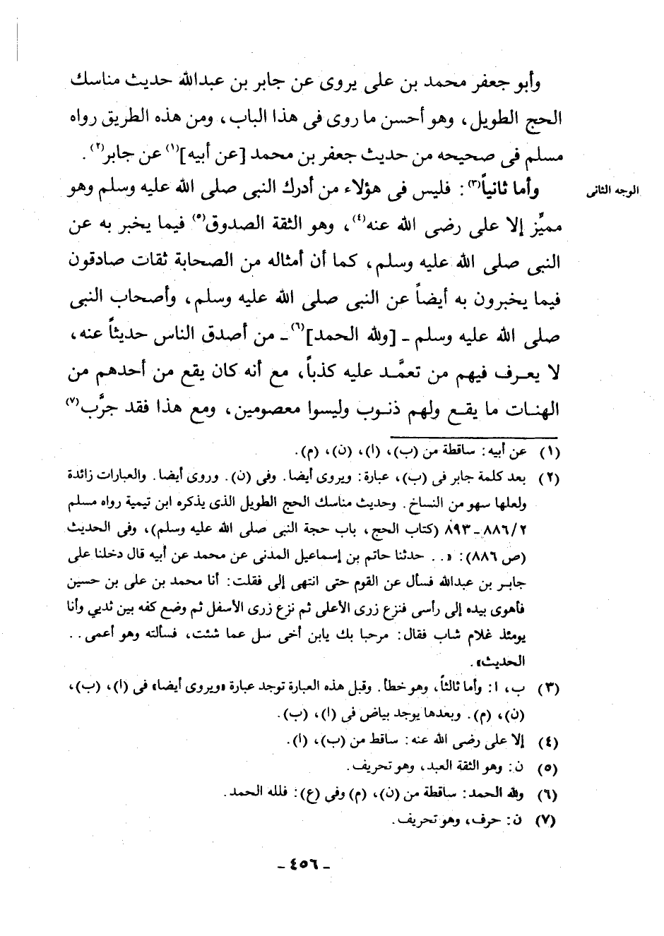 (¬2) بَعْدَ كَلِمَةِ جَابِرٍ فِي (ب) ، عِبَارَةُ: وَيُرْوَى أَيْضًا. وَفِي (ن) . وَرُوِيَ أَيْضًا. وَالْعِبَارَاتُ زَائِدَةٌ وَلَعَلَّهَا سَهْوٌ مِنَ النُّسَّاخِ. وَحَدِيثُ مَنَاسِكِ الْحَجِّ الطَّوِيلُ الَّذِي يَذْكُرُهُ ابْنُ تَيْمِيَّةَ رَوَاهُ مُسْلِمٌ 2/886 - 893 (كِتَابُ الْحَجِّ، بَابُ حَجَّةِ النَّبِيِّ - صَلَّى اللَّهُ عَلَيْهِ وَسَلَّمَ -) ، وَفِي الْحَدِيثِ (ص [0 - 9] 86) : ". . حَدَّثَنَا حَاتِمُ بْنُ إِسْمَاعِيلَ الْمَدَنِيُّ عَنْ مُحَمَّدٍ عَنْ أَبِيهِ قَالَ دَخَلْنَا عَلَى جَابِرِ بْنِ عَبْدِ اللَّهِ فَسَأَلَ عَنِ الْقَوْمِ حَتَّى انْتَهَى إِلَيَّ فَقُلْتُ: أَنَا مُحَمَّدُ بْنُ عَلِيِّ بْنِ حُسَيْنٍ فَأَهْوَى بِيَدِهِ إِلَى رَأْسِي فَنَزَعَ زِرِّي الْأَعْلَى ثُمَّ نَزَعَ زِرِّي الْأَسْفَلَ ثُمَّ وَضَعَ كَفَّهُ بَيْنَ ثَدْيِي وَأَنَا يَوْمَئِذٍ غُلَامٌ شَابٌّ فَقَالَ: مَرْحَبًا بِكَ يَا ابْنَ أَخِي سَلْ عَمَّا شِئْتَ، فَسَأَلْتُهُ وَهُوَ أَعْمَى. . الْحَدِيثَ