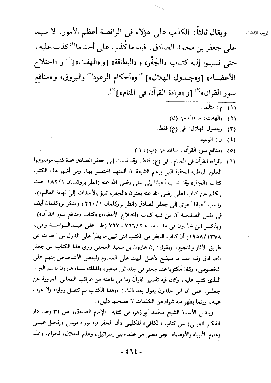 (¬6) وَقِرَاءَةِ الْقُرْآنِ فِي الْمَنَامِ: فِي (ع) فَقَطْ. وَقَدْ نُسِبَتْ إِلَى جَعْفَرٍ الصَّادِقِ عِدَّةُ كُتُبٍ مَوْضُوعُهَا الْعُلُومُ الْبَاطِنِيَّةُ الْخَفِيَّةُ الَّتِي يَزْعُمُ الشِّيعَةُ أَنَّ أَئِمَّتَهُمُ اخْتَصُّوا بِهَا، وَمِنْ أَشْهَرِ هَذِهِ الْكُتُبِ كِتَابُ " الْجَفْرِ " وَقَدْ نُسِبَ أَحْيَانًا إِلَى عَلِيٍّ رَضِيَ اللَّهُ عَنْهُ (انْظُرْ بُرُوكِلْمَانْ 1/182 حَيْثُ يَتَكَلَّمُ عَنْ كِتَابٍ لِعَلِيٍّ رَضِيَ اللَّهُ عَنْهُ بِعُنْوَانِ " الْجَفْرِ، تَنَبُّؤًا بِالْأَحْدَاثِ إِلَى نِهَايَةِ الْعَالَمِ ") . وَنُسِبَ أَحْيَانًا أُخْرَى إِلَى جَعْفَرٍ الصَّادِقِ (انْظُرْ بُرُوكِلْمَانْ 1/260، وَيَذْكُرُ بُرُوكِلْمَانْ أَيْضًا فِي نَفْسِ الصَّفْحَةِ أَنَّ مِنْ كُتُبِهِ كِتَابَ " اخْتِلَاجِ الْأَعْضَاءِ " وَكِتَابَ " مَنَافِعِ سُوَرِ الْقُرْآنِ ") . وَيَذْكُرُ ابْنُ خَلْدُونَ فِي مُقَدِّمَتِهِ 2/766 - 767 (ط. عَلِي عَبْد الْوَاحِد وَافِي، 1378/1958) أَنَّ كِتَابَ الْجَفْرِ مِنَ الْكُتُبِ الَّتِي تُبَيِّنُ مَا يَطْرَأُ عَلَى الدُّوَلِ مِنْ أَحْدَاثٍ عَنْ طَرِيقِ الْآثَارِ وَالنُّجُومِ، وَيَقُولُ: إِنَّ هَارُونَ بْنَ سَعِيدٍ الْعِجْلِيَّ رَوَى هَذَا الْكِتَابَ عَنْ جَعْفَرٍ الصَّادِقِ وَفِيهِ عِلْمُ مَا سَيَقَعُ لِأَهْلِ الْبَيْتِ عَلَى الْعُمُومِ وَلِبَعْضِ الْأَشْخَاصِ مِنْهُمْ عَلَى الْخُصُوصِ، وَكَانَ مَكْتُوبًا عِنْدَ جَعْفَرٍ فِي جِلْدِ ثَوْرٍ صَغِيرٍ، وَلِذَلِكَ سَمَّاهُ هَارُونُ بَاسِمِ الْجِلْدِ الَّذِي كُتِبَ عَلَيْهِ، وَكَانَ فِيهِ تَفْسِيرُ الْقُرْآنِ وَمَا فِي بَاطِنِهِ مِنْ غَرَائِبِ الْمَعَانِي الْمَرْوِيَّةِ عَنْ جَعْفَرٍ. عَلَى أَنَّ ابْنَ خَلْدُونَ يَقُولُ بَعْدَ ذَلِكَ: " وَهَذَا الْكِتَابُ لَمْ تَتَّصِلْ رِوَايَتُهُ وَلَا عُرِفَ عَيْنُهُ، وَإِنَّمَا يَظْهَرُ مِنْهُ شَوَاذُّ مِنَ الْكَلِمَاتِ لَا يَصْحَبُهَا دَلِيلٌ ". وَيَنْقُلُ الْأُسْتَاذُ الشَّيْخُ مُحَمَّد أَبُو زَهْرَةَ فِي كِتَابِهِ: الْإِمَامِ الصَّادِقِ، ص [0 - 9] 4 (ط. دَارِ الْفِكْرِ الْعَرَبِيِّ) عَنْ كِتَابِ " الْكَافِي " لِلْكُلَيْنِيِّ " أَنَّ الْجَفْرَ فِيهِ تَوْرَاةُ مُوسَى وَإِنْجِيلُ عِيسَى وَعُلُومُ الْأَنْبِيَاءِ وَالْأَوْصِيَاءِ، وَمَنْ مَضَى مِنْ عُلَمَاءِ بَنِي إِسْرَائِيلَ، وَعِلْمُ الْحَلَالِ وَالْحَرَامِ، وَعِلْمُ مَا كَانَ وَمَا يَكُونُ. ثُمَّ يَذْكُرُ أَنَّ الْجَفْرَ قِسْمَانِ: أَحَدُهُمَا كُتِبَ عَلَى إِهَابِ مَاعِزٍ، وَالْآخَرُ كُتِبَ عَلَى إِهَابِ كَبْشٍ ". وَانْظُرِ: الْكَافِي لِلْكُلَيْنِيِّ 1/238 - 242، ط. طَهْرَانَ، 1381. وَانْظُرْ عَنِ الْجَفْرِ وَسَائِرِ كُتُبِ الشِّيعَةِ الْبَاطِنِيَّةِ: دَائِرَةَ الْمَعَارِفِ الْإِسْلَامِيَّةِ، مَادَّةَ " الْجَفْرِ " بِقَلَمِ مَاكْدُونَالْد، مَادَّةَ " جَعْفَرِ بْنِ مُحَمَّدٍ الصَّادِقِ " بِقَلَمِ سترشتين ; جُولْدتسيهر: الْعَقِيدَةَ وَالشَّرِيعَةَ فِي الْإِسْلَامِ (الطَّبْعَةَ الثَّانِيَةَ) ، ص 211 - 212 - 371 - 372 ; مُحَمَّد أَبُو زَهْرَةَ: الْإِمَامُ الصَّادِقُ، ص [0 - 9] 3 - 37. وَقَارِنِ: التَّهَانَوِيَّ: كَشَّافُ اصْطِلَاحَاتِ الْفُنُونِ، مَادَّةُ " الْجَفْرِ ".
