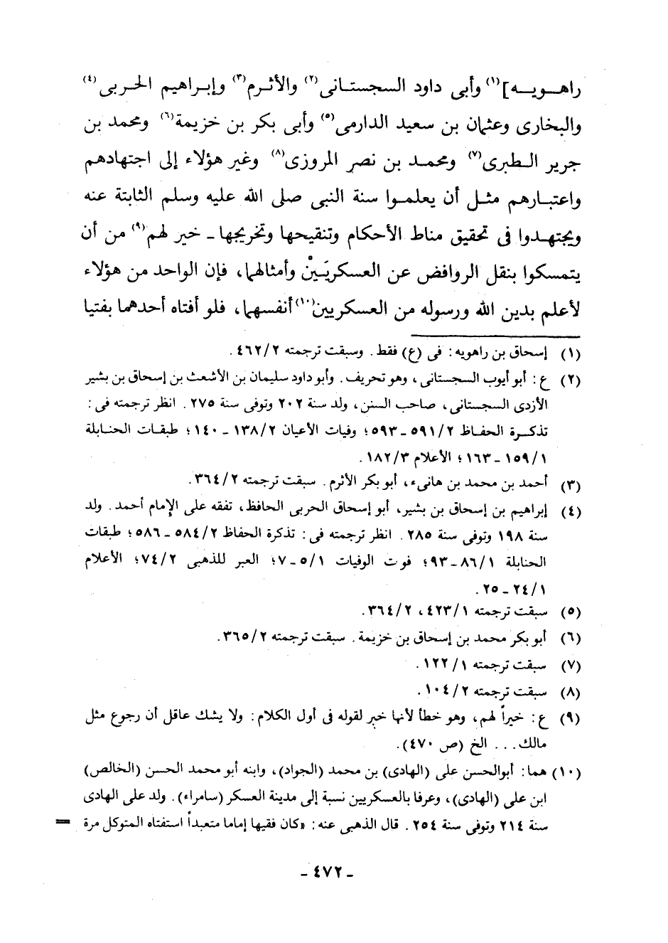 رَاهَوَيْهِ] (¬1) وَأَبِي دَاوُدَ السِّجِسْتَانِيِّ (¬2) وَالْأَثْرَمِ (¬3) وَإِبْرَاهِيمَ الْحَرْبِيِّ (¬4) . وَالْبُخَارِيِّ وَعُثْمَانَ بْنِ سَعِيدٍ الدَّارِمِيِّ (¬5) وَأَبِي بَكْرِ بْنِ خُزَيْمَةَ (¬6) وَمُحَمَّدِ بْنِ جَرِيرٍ الطَّبَرِيِّ (¬7) وَمُحَمَّدِ بْنِ نَصْرٍ الْمَرْوَزِيِّ (¬8) وَغَيْرِ هَؤُلَاءِ إِلَى اجْتِهَادِهِمْ وَاعْتِبَارِهِمْ مِثْلَ أَنْ يَعْلَمُوا سُنَّةَ النَّبِيِّ - صَلَّى اللَّهُ عَلَيْهِ وَسَلَّمَ - الثَّابِتَةَ عَنْهُ وَيَجْتَهِدُوا فِي تَحْقِيقِ مَنَاطِ الْأَحْكَامِ وَتَنْقِيحِهَا وَتَخْرِيجِهَا - خَيْرٌ لَهُمْ (¬9) مِنْ أَنْ يَتَمَسَّكُوا بِنَقْلِ الرَّوَافِضِ عَنِ الْعَسْكَرِيَّيْنِ وَأَمْثَالِهِمَا، فَإِنَّ الْوَاحِدَ مِنْ هَؤُلَاءِ لَأَعْلَمُ بِدِينِ اللَّهِ وَرَسُولِهِ مِنَ الْعَسْكَرِيَّيْنِ (¬10) أَنْفُسِهِمَا، فَلَوْ أَفْتَاهُ أَحَدُهُمَا بِفُتْيَا
