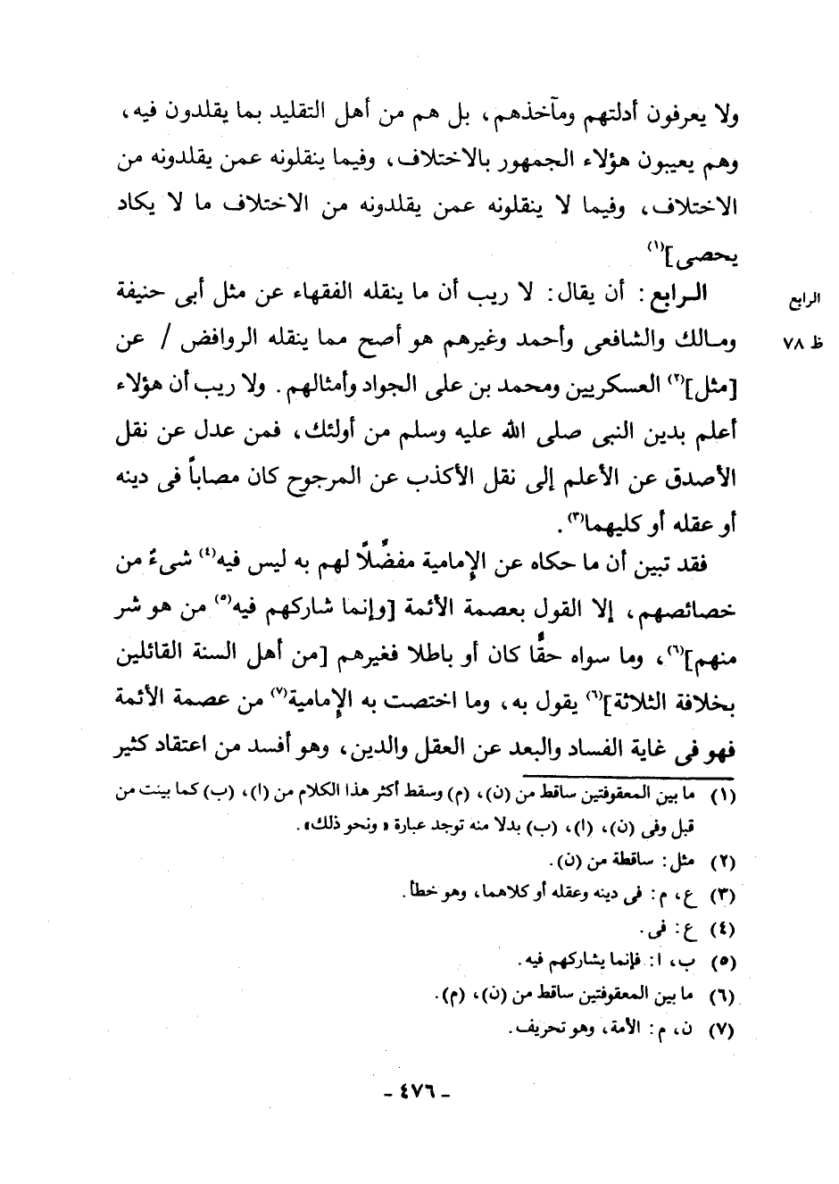 الرَّابِعُ: أَنْ يُقَالَ: لَا رَيْبَ أَنَّ مَا يَنْقُلُهُ الْفُقَهَاءُ عَنْ مِثْلِ أَبِي حَنِيفَةَ وَمَالِكٍ وَالشَّافِعِيِّ وَأَحْمَدَ وَغَيْرِهِمْ هُوَ أَصَحُّ مِمَّا يَنْقُلُهُ الرَّوَافِضُ عَنْ [مِثْلِ] (¬2) الْعَسْكَرِيَّيْنِ وَمُحَمَّدِ بْنِ عَلِيٍّ الْجَوَادِ وَأَمْثَالِهِمْ. وَلَا رَيْبَ أَنَّ هَؤُلَاءِ أَعْلَمُ بِدِينِ النَّبِيِّ - صَلَّى اللَّهُ عَلَيْهِ وَسَلَّمَ - مِنْ أُولَئِكَ فَمَنْ عَدَلَ عَنْ نَقْلِ الْأَصْدَقِ عَنِ الْأَعْلَمِ إِلَى نَقْلِ الْأَكْذَبِ عَنِ الْمَرْجُوحِ كَانَ مُصَابًا فِي دِينِهِ أَوْ عَقْلِهِ أَوْ كِلَيْهِمَا (¬3) .