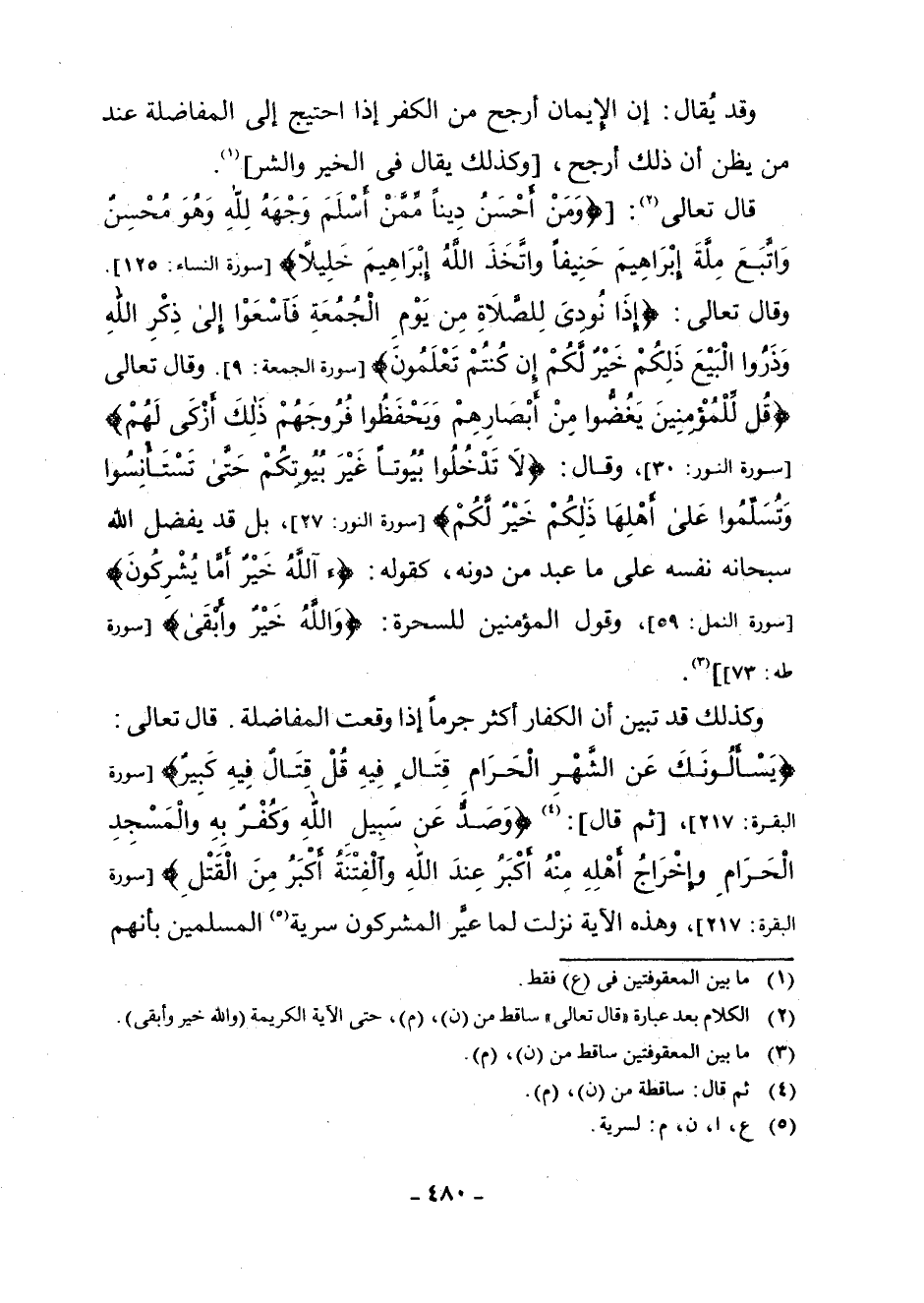 وَقَدْ يُقَالُ: إِنَّ الْإِيمَانَ أَرْجَحُ مِنَ الْكُفْرِ إِذَا احْتِيجَ إِلَى الْمُفَاضَلَةِ عِنْدَ مَنْ يَظُنُّ أَنَّ ذَلِكَ أَرْجَحُ، [وَكَذَلِكَ يُقَالُ فِي الْخَيْرِ وَالشَّرِّ] (¬1) .
