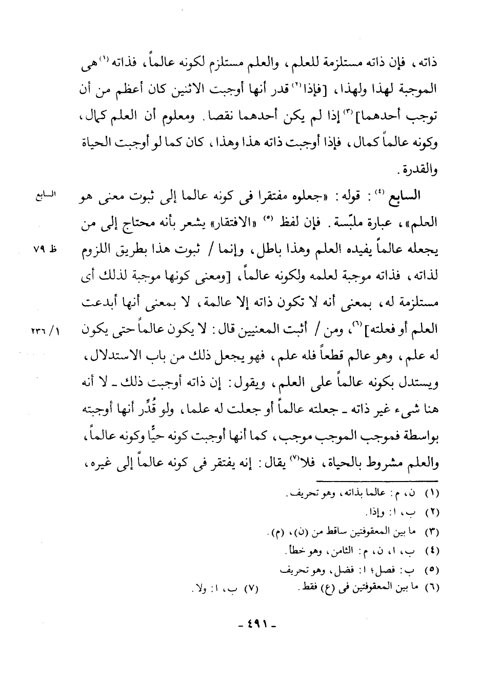 السَّابِعُ (¬4) : قَوْلُهُ: " جَعَلُوهُ مُفْتَقِرًا فِي كَوْنِهِ عَالِمًا إِلَى ثُبُوتِ مَعْنًى هُوَ الْعِلْمُ "، عِبَارَةٌ مُلْبِسَةٌ. فَإِنَّ لَفْظَ (¬5) " الِافْتِقَارِ " يُشْعِرُ بِأَنَّهُ مُحْتَاجٌ إِلَى مَنْ يَجْعَلُهُ عَالِمًا يُفِيدُهُ الْعِلْمُ وَهَذَا بَاطِلٌ، وَإِنَّمَا ثُبُوتُ هَذَا بِطْرِيقِ اللُّزُومِ لِذَاتِهِ، فَذَاتُهُ مُوجِبَةٌ لِعِلْمِهِ وَلِكَوْنِهِ عَالِمًا، [وَمَعْنَى كَوْنِهَا مُوجِبَةً لِذَلِكَ أَيْ مُسْتَلْزِمَةً لَهُ، بِمَعْنَى أَنَّهُ لَا تَكُونُ ذَاتُهُ إِلَّا عَالِمَةً، لَا بِمَعْنَى أَنَّهَا أَبْدَعَتِ الْعِلْمَ أَوْ فَعَلَتْهُ] (¬6) ، وَمَنْ أَثْبَتَ الْمَعْنَيَيْنِ قَالَ: لَا يَكُونُ عَالِمًا حَتَّى يَكُونَ لَهُ عِلْمٌ، وَهُوَ عَالِمٌ قَطْعًا فَلَهُ عِلْمٌ، فَهُوَ يَجْعَلُ ذَلِكَ مِنْ بَابِ الِاسْتِدْلَالِ، وَيَسْتَدِلُّ بِكَوْنِهِ عَالِمًا عَلَى الْعِلْمِ، وَيَقُولُ: إِنَّ ذَاتَهُ أَوْجَبَتْ ذَلِكَ - لَا أَنَّهُ هُنَا شَيْءٌ غَيْرُ ذَاتِهِ - جَعَلَتْهُ عَالِمًا أَوْ جَعَلَتْ لَهُ عِلْمًا، وَلَوْ قُدِّرَ أَنَّهَا أَوْجَبَتْهُ بِوَاسِطَةٍ فَمُوجِبُ الْمُوجَبِ مُوجِبٌ، كَمَا أَنَّهَا أَوْجَبَتْ كَوْنَهُ حَيًّا وَكَوْنَهُ عَالِمًا، وَالْعِلْمُ مَشْرُوطٌ بِالْحَيَاةِ، فَلَا (¬7) يُقَالُ: إِنَّهُ يَفْتَقِرُ فِي كَوْنِهِ عَالِمًا إِلَى غَيْرِهِ،