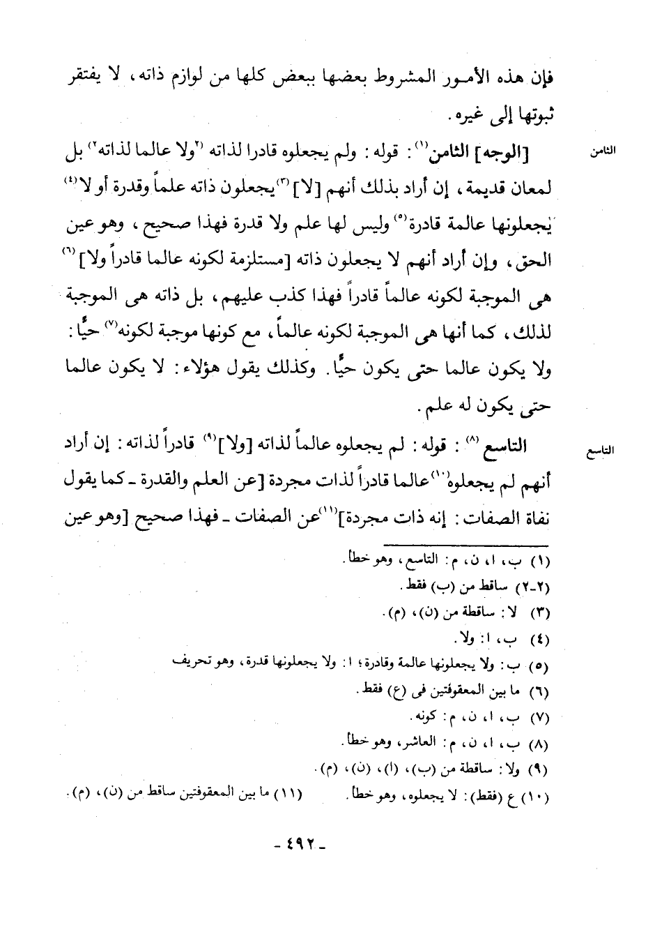 التَّاسِعُ (¬8) : قَوْلُهُ: لَمْ يَجْعَلُوهُ عَالِمًا لِذَاتِهِ [وَلَا] (¬9) قَادِرًا لِذَاتِهِ: إِنْ أَرَادَ أَنَّهُمْ لَمْ يَجْعَلُوهُ (¬10) عَالِمًا قَادِرًا لِذَاتٍ مُجَرَّدَةٍ [عَنِ الْعِلْمِ وَالْقُدْرَةِ - كَمَا يَقُولُ نُفَاةُ الصِّفَاتِ: إِنَّهُ ذَاتٌ مُجَرَّدَةٌ] (¬11) عَنِ الصِّفَاتِ - فَهَذَا صَحِيحٌ [وَهُوَ عَيْنُ