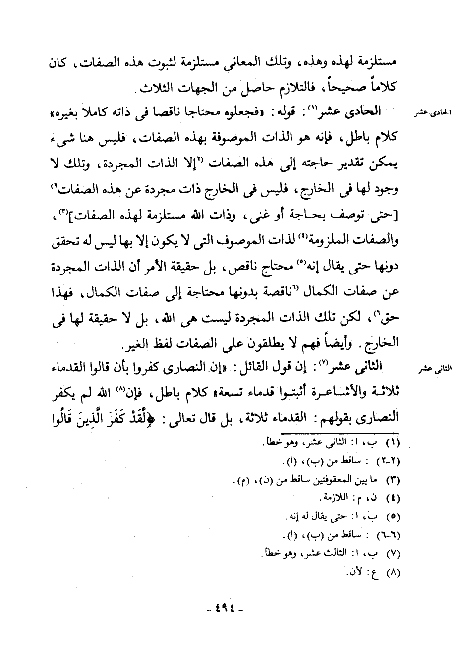 الثَّانِي عَشَرَ (¬7) : إِنَّ قَوْلَ الْقَائِلِ: " إِنَّ النَّصَارَى كَفَرُوا بِأَنْ قَالُوا: الْقُدَمَاءُ ثَلَاثَةٌ وَالْأَشَاعِرَةُ أَثْبَتُوا قُدَمَاءَ تِسْعَةً " كَلَامٌ بَاطِلٌ، فَإِنَّ (¬8) اللَّهَ لَمْ يُكَفِّرِ النَّصَارَى بِقَوْلِهِمُ: الْقُدَمَاءُ ثَلَاثَةٌ، بَلْ قَالَ تَعَالَى: