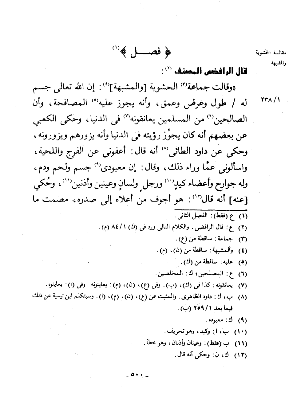 (فَصْلٌ) (¬1) قَالَ الرَّافِضِيُّ الْمُصَنِّفُ (¬2) : وَقَالَتْ جَمَاعَةُ (¬3) الْحَشْوِيَّةِ [وَالْمُشَبِّهَةِ] (¬4) : إِنَّ اللَّهَ تَعَالَى جِسْمٌ لَهُ طُولٌ وَعَرْضٌ وَعُمْقٌ، وَأَنَّهُ يَجُوزُ عَلَيْهِ (¬5) الْمُصَافَحَةُ، وَأَنَّ الصَّالِحِينَ (¬6) مِنَ الْمُسْلِمِينَ يُعَانِقُونَهُ (¬7) فِي الدُّنْيَا، وَحَكَى الْكَعْبِيُّ عَنْ بَعْضِهِمْ أَنَّهُ كَانَ يُجَوِّزُ رُؤْيَتَهُ فِي الدُّنْيَا وَأَنَّهُ يَزُورُهُمْ وَيَزُورُونَهُ، وَحُكِيَ عَنْ دَاوُدَ الطَّائِيِّ (¬8) أَنَّهُ قَالَ: أَعْفُونِي عَنِ الْفَرْجِ وَاللِّحْيَةِ، وَاسْأَلُونِي عَمَّا وَرَاءَ ذَلِكَ، وَقَالَ: إِنَّ مَعْبُودِي (¬9) جِسْمٌ وَلَحْمٌ وَدَمٌ، وَلَهُ جَوَارِحُ وَأَعْضَاءٌ كَيَدٍ (¬10) وَرِجْلٍ وَلِسَانٍ وَعَيْنَيْنِ وَأُذُنَيْنِ (¬11) ، وَحُكِيَ عَنْهُ أَنَّهُ قَالَ (¬12) : هُوَ أَجْوَفُ مِنْ أَعْلَاهُ إِلَى صَدْرِهِ، مُصْمَتٌ مَا