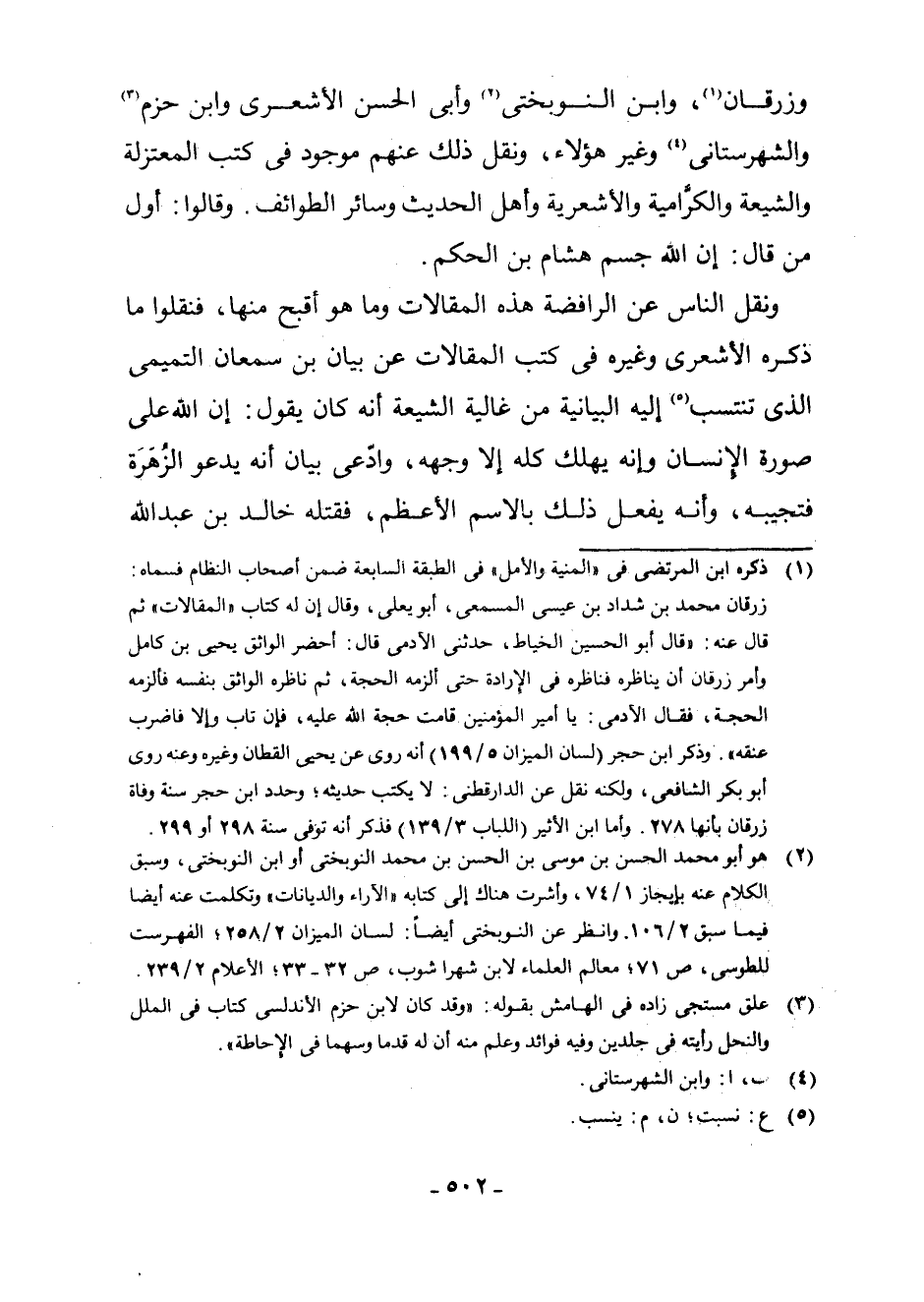وَزَرْقَانَ (¬1) ، وَابْنِ النُّوبَخْتِيِّ (¬2) ، (¬3) . وَأَبِي الْحَسَنِ الْأَشْعَرِيِّ وَابْنِ حَزْمٍ (¬4) وَالشَّهْرَسْتَانِيِّ (¬5) وَغَيْرِ هَؤُلَاءِ، وَنَقْلُ ذَلِكَ عَنْهُمْ مَوْجُودٌ فِي كُتُبِ الْمُعْتَزِلَةِ وَالشِّيعَةِ وَالْكَرَّامِيَّةِ وَالْأَشْعَرِيَّةِ وَأَهْلِ الْحَدِيثِ وَسَائِرِ الطَّوَائِفِ. وَقَالُوا: أَوَّلُ مَنْ قَالَ إِنَّ اللَّهَ جِسْمٌ هِشَامُ بْنُ الْحَكَمِ.