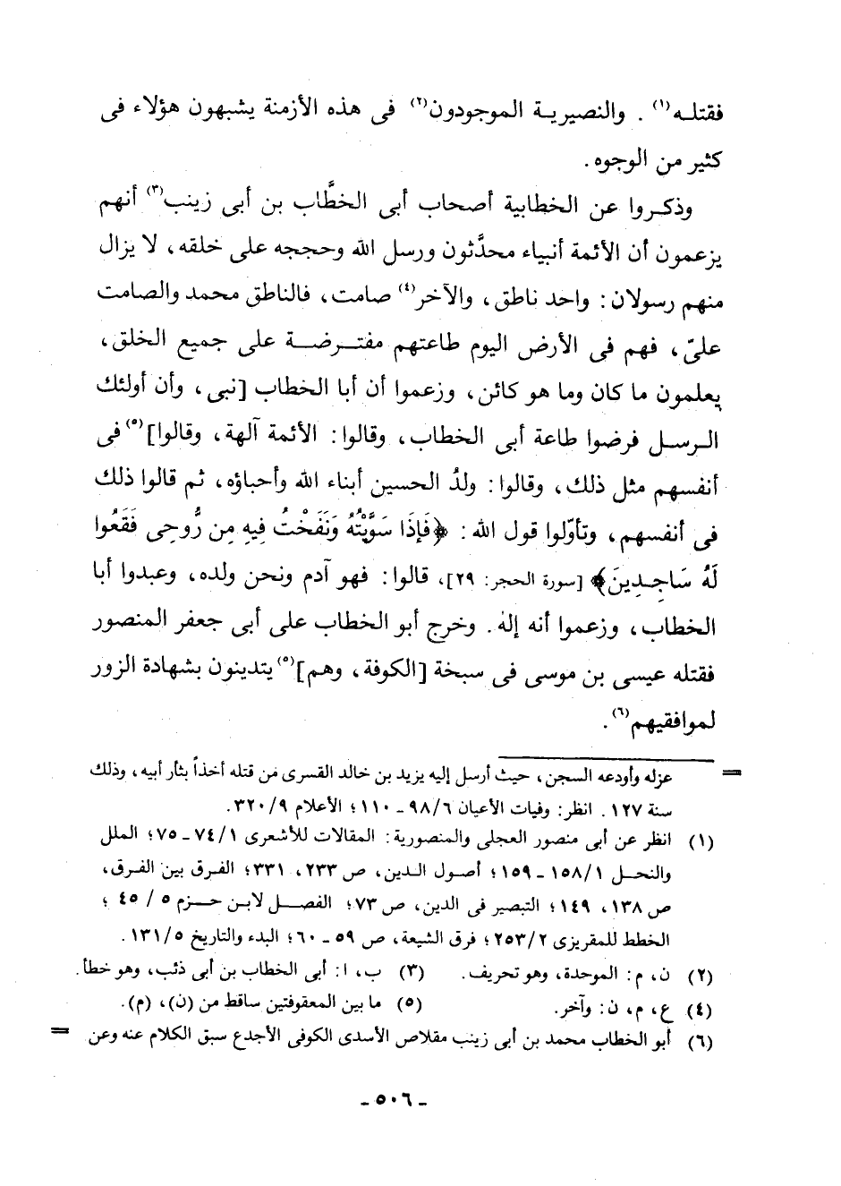(¬7) أَبُو الْخَطَّابِ مُحَمَّدُ بْنُ أَبِي زَيْنَبَ مِقْلَاصٌ الْأَسَدِيُّ الْكُوفِيُّ الْأَجْدَعُ سَبَقَ الْكَلَامُ عَنْهُ وَعَنْ فِرْقَتِهِ 1/64 ت [0 - 9] . وَالَّذِي ذَكَرَهُ ابْنُ تَيْمِيَّةَ عَنْهُ وَعَنِ الْخَطَّابِيَّةِ هُنَا هُوَ تَقْرِيبًا مَا فِي مَقَالَاتِ الْأَشْعَرِيِّ 1 - 77. وَانْظُرْ أَيْضًا: أُصُولَ الدِّينِ، ص [0 - 9] 98، 331 ; التَّبْصِيرَ فِي الدِّينِ، ص [0 - 9] 3 - 74 ; الْفِصَلَ لِابْنِ حَزْمٍ 5/48 ; الْخِطَطَ لِلْمَقْرِيزِيِّ 2/352 ; التَّنَبُّهَ لِلْمَلْطِيِّ، ص [0 - 9] 54 ; فِرَقَ الشِّيعَةِ، ص [0 - 9] 3 - 64 ; الْبَدْءَ وَالتَّارِيخَ 5/131 ; الرِّجَالَ لِلْكَشِّيِّ (ط. الْأَعْلَمِيِّ، النَّجَفَ) ، ص [0 - 9] 46 - 260. وَانْظُرِ التَّعْلِيقَ الْآتِي عَنِ الْبَزِيغِيَّةِ. وَفِي هَامِشِ (ع) كَتَبَ مُسْتَجِي زَادَه التَّعْلِيقَ التَّالِيَ: " وَالْحَاصِلُ أَنَّ الطَّائِفَةَ الْمَنْسُوبَةَ إِلَى بَيَانِ بْنِ سَمْعَانَ الَّتِي يُقَالُ لَهُمُ الْبَيَانِيَّةُ، وَالطَّائِفَةَ الْمَنْسُوبَةَ إِلَى أَبِي مَنْصُورٍ الَّتِي يُقَالُ لَهُمُ الْمَنْصُورِيَّةُ، وَالطَّائِفَةَ الْمَنْسُوبَةَ إِلَى أَبِي الْخَطَّابِ الَّتِي يُقَالُ لَهُمُ الْخَطَّابِيَّةُ: كُلُّهُمْ مِنْ غُلَاةِ الرَّوَافِضِ، وَأَنَّهُمْ يَسْتَحِلُّونَ الْمَحَارِمَ، وَأَنَّهُمْ يَقُولُونَ بِعَدَمِ انْقِطَاعِ النُّبُوَّةِ وَبِارْتِفَاعِ التَّكَالِيفِ، وَأَنَّهُمْ أَقْدَمُ الْبَاطِنِيَّةِ، وَالْبَيَانِيَّةُ أَقْدَمُ أَلْوَانِ (؟) الدُّرُوزِ، وَالنُّصَيْرِيَّةُ مِنْ شِيعَتِهِمْ، وَالْحَمْزَوِيَّةُ مِنْ أَتْبَاعِهِمْ. وَالْمَقَالَاتُ الْمَنْسُوبَةُ إِلَى بَيَانِ بْنِ سَمْعَانَ أَخَذَ بِهَا بَعْدَهُ طَائِفَةٌ يُقَالُ لَهُمُ الْبَاطِنِيَّةُ وَالْإِسْمَاعِيلِيَّةُ، وَمِمَّنِ اشْتُهِرَ مِنْهُمْ حَسَنُ بْنُ الصَّبَاحِ الَّذِي جَاءَ فِي عَصْرِ مَلِكْشَاه السَّلْجُوقِيِّ، وَأَلَّفَ كُتُبًا كَثِيرَةً يُبَيِّنُ مَقَالَاتِ الْبَاطِنِيَّةِ وَيَنْصُرُهُمْ وَيُنَافِحُ عَنْهُمْ، وَاسْتَوْلَى عَلَى الْقِلَاعِ فِي فَارِسَ وَجُبَيْلٍ (؟) وَتَسَلْطَنَ هُنَاكَ حَتَّى يُقَالَ لَهُ: صَاحِبُ الْقِلَاعِ، وَقَدْ حَاوَلَ الرَّدَّ وَإِبْطَالَ كَلَامِهِ كَثِيرٌ مِنَ الْعُلَمَاءِ، وَمِنْهُمُ الْإِمَامُ الْغَزَالِيُّ الطُّوسِيُّ: أَلَّفَ فِي إِبْطَالِ كَلَامِهِ كُتُبًا كَثِيرَةً، وَالنُّصَيْرِيَّةُ وَالدُّرُوزُ الَّذِينَ كَانُوا فِي نَوَاحِي الشَّامِ وَمِنْهُمْ بَنُو الْعُبَيْدِ وَيُقَالُ لَهُمُ الْفَاطِمِيُّونَ أَيْضًا، اسْتَوْلَوْا عَلَى بِلَادِ الْمَغْرِبِ أَوَّلًا، ثُمَّ عَلَى بِلَادِ. . . وَمِصْرَ، وَمِنْهُمْ طَائِفَةٌ مِنَ الرُّومِ يُقَالُ لَهُمُ الْحَمْزَوِيَّةُ وَالْبَيْرَامِيَّةُ كَانُوا عَلَى مَسْلَكِ هَؤُلَاءِ الْبَاطِنِيَّةِ. وَالْجَمِيعُ فِرْقَةٌ مِنْ فِرَقَ الرَّوَافِضِ الْغَالِيَةِ الَّذِينَ قَالُوا بِقِدَمِ الْعَالَمِ وَعَدَمِ الْحَشْرِ وَالنَّشْرِ وَبِالتَّجْسِيمِ وَالتَّنَاسُخِ وَالْحُلُولِ "