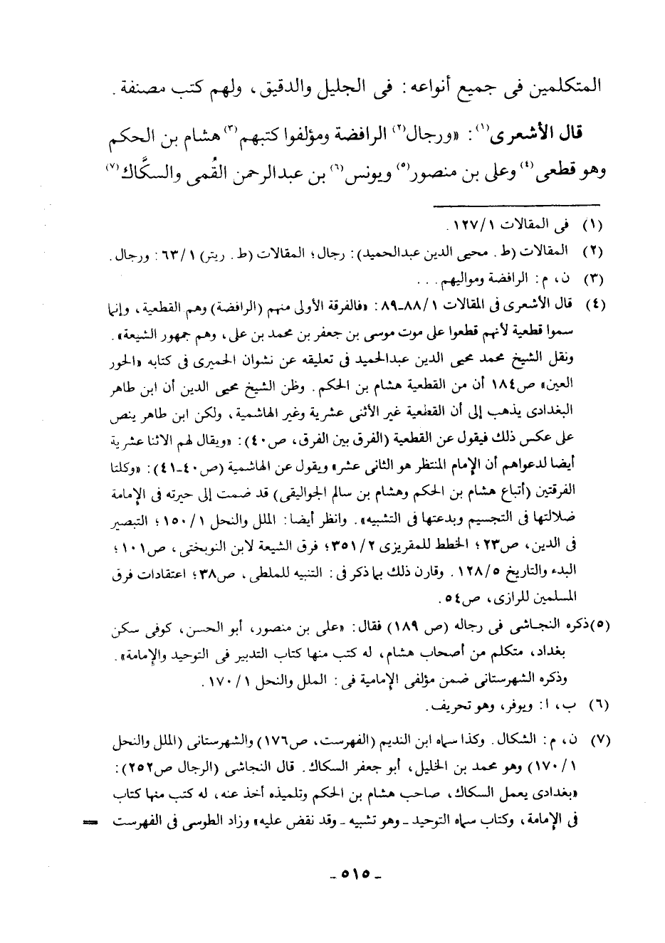 (¬4) قَالَ الْأَشْعَرِيُّ فِي الْمَقَالَاتِ 1/88 - 89: " فَالْفِرْقَةُ الْأُولَى مِنْهُمُ (الرَّافِضَةُ) وَهُمُ الْقَطْعِيَّةُ، وَإِنَّمَا سُمُّوا قَطْعِيَّةً لِأَنَّهُمْ قَطَعُوا عَلَى مَوْتِ مُوسَى بْنِ جَعْفَرِ بْنِ مُحَمَّدِ بْنِ عَلِيٍّ، وَهُمْ جُمْهُورُ الشِّيعَةِ ". وَنَقَلَ الشَّيْخُ مُحَمَّد مُحْيِي الدِّينِ عَبْد الْحَمِيدِ فِي تَعْلِيقِهِ عَنْ نَشْوَانَ الْحِمْيَرِيِّ فِي كِتَابِهِ " الْحُورِ الْعِينِ " ص [0 - 9] 84 أَنَّ مِنَ الْقَطْعِيَّةِ هِشَامَ بْنَ الْحَكَمِ. وَظَنَّ الشَّيْخُ مُحْيِي الدِّينِ أَنَّ ابْنَ طَاهِرٍ الْبَغْدَادِيَّ يَذْهَبُ إِلَى أَنَّ الْقَطْعِيَّةَ غَيْرُ الِاثْنَيْ عَشْرِيَّةِ وَغَيْرُ الْهَاشِمِيَّةِ، وَلَكِنَّ ابْنَ طَاهِرٍ يَنُصُّ عَلَى عَكْسِ ذَلِكَ فَيَقُولُ عَنِ الْقَطْعِيَّةِ (الْفَرْقُ بَيْنَ الْفِرَقِ، ص [0 - 9] 0) : " وَيُقَالُ لَهُمُ الِاثْنَا عَشْرِيَّةُ أَيْضًا لِدَعْوَاهُمْ أَنَّ الْإِمَامَ الْمُنْتَظَرَ هُوَ الثَّانِي عَشَرَ " وَيَقُولُ عَنِ الْهَاشِمِيَّةِ (ص [0 - 9] 0 - 41) : " وَكِلْتَا الْفِرْقَتَيْنِ (أَتْبَاعُ هِشَامِ بْنِ الْحَكَمِ وَهِشَامِ بْنِ سَالِمٍ الْجَوَالِيقِيِّ) قَدْ ضَمَّتْ إِلَى حَيْرَتِهِ فِي الْإِمَامِيَّةِ ضَلَالَتَهَا فِي التَّجْسِيمِ وَبِدْعَتَهَا فِي التَّشْبِيهِ ". وَانْظُرْ أَيْضًا: الْمِلَلَ وَالنِّحَلَ 1/150 ; التَّبْصِيرَ فِي الدِّينِ، ص 23 ; الْخِطَطَ لِلْمَقْرِيزِيِّ 2/351 ; فِرَقَ الشِّيعَةِ لِابْنِ النُّوبَخْتِيِّ، ص [0 - 9] 01 ; الْبَدْءَ وَالتَّارِيخَ 5/128. وَقَارِنْ ذَلِكَ بِمَا ذُكِرَ فِي: التَّنَبُّهِ لِلْمَلْطِيِّ، ص [0 - 9] 8 ; اعْتِقَادَاتِ فِرَقِ الْمُسْلِمِينَ لِلرَّازِيِّ، ص [0 - 9] 4.