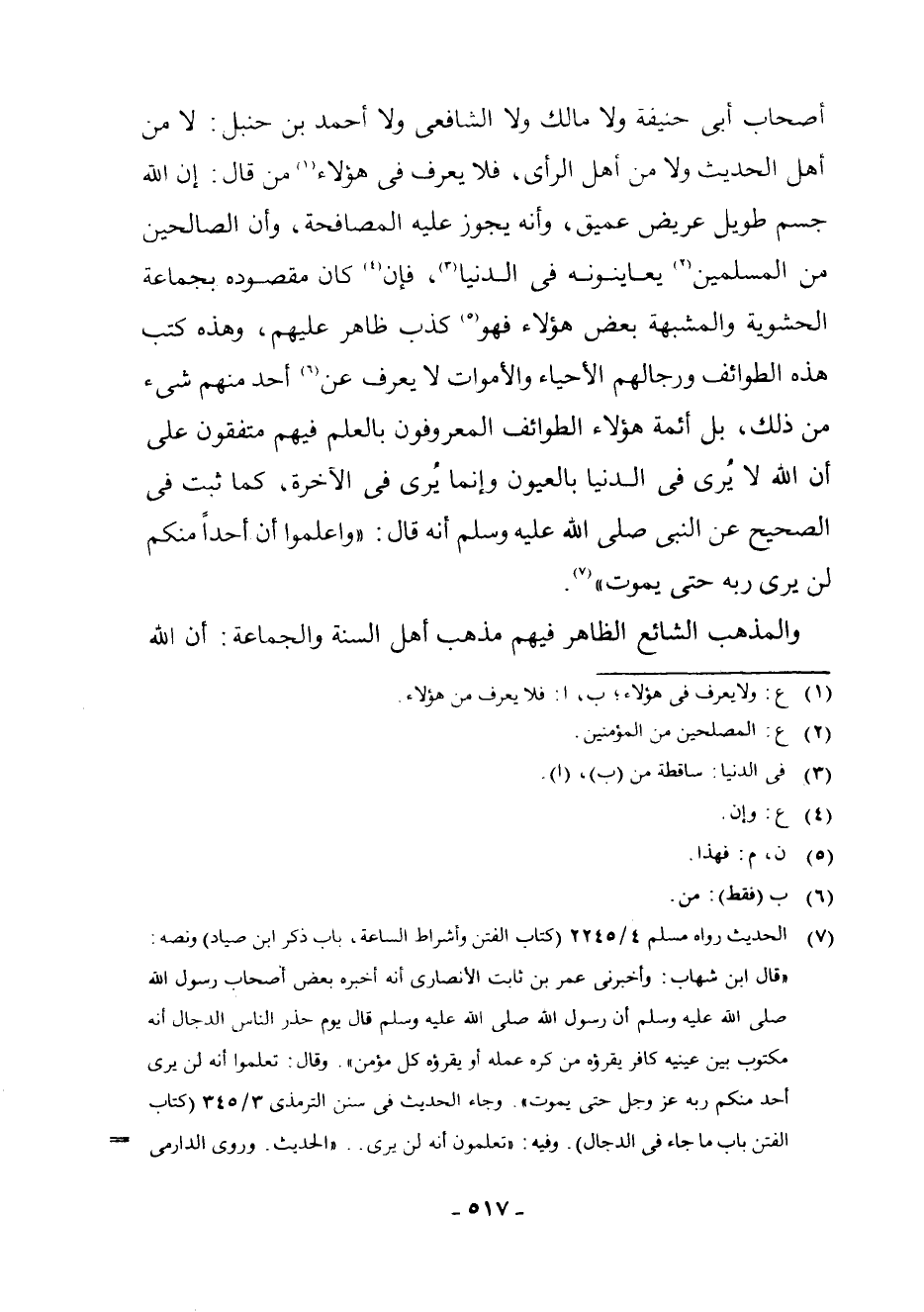 (¬7) الْحَدِيثُ رَوَاهُ مُسْلِمٌ 4/2245 (كِتَابُ الْفِتَنِ وَأَشْرَاطِ السَّاعَةِ، بَابُ ذِكْرِ ابْنِ صَيَّادٍ) وَنَصُّهُ: " قَالَ ابْنُ شِهَابٍ: وَأَخْبَرَنِي عُمَرُ بْنُ ثَابِتٍ الْأَنْصَارِيُّ أَنَّهُ أَخْبَرَهُ بَعْضُ أَصْحَابِ رَسُولِ اللَّهِ - صَلَّى اللَّهُ عَلَيْهِ وَسَلَّمَ - أَنَّ رَسُولَ اللَّهِ - صَلَّى اللَّهُ عَلَيْهِ وَسَلَّمَ - قَالَ يَوْمَ حَذَّرَ النَّاسَ الدَّجَّالَ أَنَّهُ مَكْتُوبٌ بَيْنَ عَيْنَيْهِ كَافِرٌ يَقْرَؤُهُ مَنْ كَرِهَ عَمَلَهُ أَوْ يَقْرَؤُهُ كُلُّ مُؤْمِنٍ ". وَقَالَ: تَعَلَّمُوا أَنَّهُ لَنْ يَرَى أَحَدٌ مِنْكُمْ رَبَّهُ عَزَّ وَجَلَّ حَتَّى يَمُوتَ ". وَجَاءَ الْحَدِيثُ فِي سُنَنِ التِّرْمِذِيِّ 3/345 (كِتَابُ الْفِتَنِ بَابُ مَا جَاءَ فِي الدَّجَّالِ) . وَفِيهِ: " تَعْلَمُونَ أَنَّهُ لَنْ يَرَى. . " الْحَدِيثَ. وَرَوَى الدَّارِمِيُّ الْحَدِيثَ فِي كِتَابِهِ " الرَّدِّ عَلَى الْجَهْمِيَّةِ " ص [0 - 9] 1 وَفِيهِ: وَقَالَ: " تَعْلَمُونَ أَنَّهُ لَنْ يَرَى أَحَدُكُمْ رَبَّهُ حَتَّى يَمُوتَ ". وَوَرَدَتْ هَذِهِ الْعِبَارَةُ بِمَعْنَاهَا فِي حَدِيثٍ آخَرَ طَوِيلٍ عَنْ أُمَامَةَ الْبَاهِلِيِّ رَضِيَ اللَّهُ عَنْهُ جَاءَ فِيهِ (سُنَنِ ابْنِ مَاجَهْ 2/36 كِتَابُ الْفِتَنِ، بَابُ فِتْنَةِ الدَّجَّالِ) : " أَنَّهُ يَبْدَأُ فَيَقُولُ: أَنَا نَبِيٌّ وَلَا نَبِيَّ بَعْدِي ثُمَّ يُثَنِّي فَيَقُولُ: أَنَا رَبُّكُمْ، وَلَا تَرَوْنَ رَبَّكُمْ حَتَّى تَمُوتُوا. . . الْحَدِيثَ