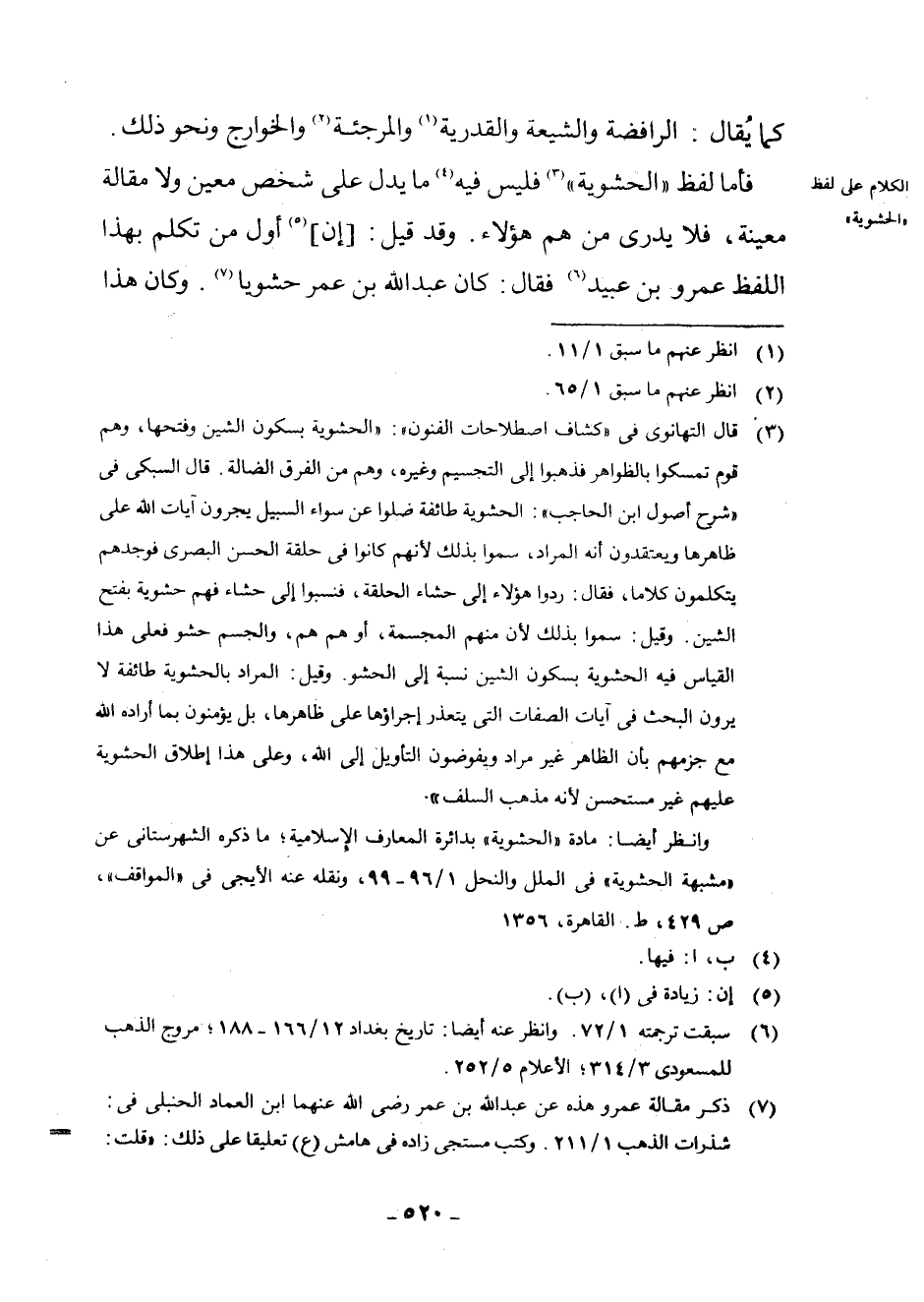 (¬3) قَالَ التَّهَانَوِيُّ فِي " كَشَّافِ اصْطِلَاحَاتِ الْفُنُونِ ": " الْحَشْوِيَّةُ بِسُكُونِ الشِّينِ وَفَتْحِهَا، وَهُمْ قَوْمٌ تَمَسَّكُوا بِالظَّوَاهِرِ فَذَهَبُوا إِلَى التَّجْسِيمِ وَغَيْرِهِ، وَهُمْ مِنَ الْفِرَقِ الضَّالَّةِ. قَالَ السُّبْكِيُّ فِي " شَرْحِ أُصُولِ ابْنِ الْحَاجِبِ ": الْحَشْوِيَّةُ طَائِفَةٌ ضَلُّوا عَنْ سَوَاءِ السَّبِيلِ يُجْرُونَ آيَاتِ اللَّهِ عَلَى ظَاهِرِهَا وَيَعْتَقِدُونَ أَنَّهُ الْمُرَادُ، سُمُّوا بِذَلِكَ لِأَنَّهُمْ كَانُوا فِي حَلْقَةِ الْحَسَنِ الْبَصْرِيِّ فَوَجَدَهُمْ يَتَكَلَّمُونَ كَلَامًا، فَقَالَ: رُدُّوا هَؤُلَاءِ إِلَى حَشَاءِ الْحَلْقَةِ، فَنُسِبُوا إِلَى حَشَاءٍ فَهُمْ حَشَوِيَّةٌ بِفَتْحِ الشِّينِ. وَقِيلَ: سُمُّوا بِذَلِكَ لِأَنَّ مِنْهُمُ الْمُجَسِّمَةَ، أَوْ هُمْ هُمْ، وَالْجِسْمُ حَشْوٌ فَعَلَى هَذَا الْقِيَاسُ فِيهِ بِسُكُونِ الشِّينِ نِسْبَةً إِلَى الْحَشْوِ. وَقِيلَ: الْمُرَادُ بِالْحَشْوِيَّةِ طَائِفَةٌ لَا يَرَوْنَ الْبَحْثَ فِي آيَاتِ الصِّفَاتِ الَّتِي يُتَعَذَّرُ إِجْرَاؤُهَا عَلَى ظَاهِرِهَا، بَلْ يُؤْمِنُونَ بِمَا أَرَادَهُ اللَّهُ مَعَ جَزْمِهِمْ بِأَنَّ الظَّاهِرَ غَيْرُ مُرَادٍ وَيُفَوِّضُونَ التَّأْوِيلَ إِلَى اللَّهِ، وَعَلَى هَذَا إِطْلَاقُ الْحَشْوِيَّةِ عَلَيْهِمْ غَيْرُ مُسْتَحْسَنٍ؛ لِأَنَّهُ مَذْهَبُ السَّلَفِ ". وَانْظُرْ أَيْضًا: مَادَّةَ " الْحَشْوِيَّةِ ". بِدَائِرَةِ الْمَعَارِفِ الْإِسْلَامِيَّةِ ; مَا ذَكَرَهُ الشَّهْرَسْتَانِيُّ عَنْ " مُشَبِّهَةِ الْحَشْوِيَّةِ " فِي الْمِلَلِ وَالنِّحَلِ 1/96 - 99، وَنَقَلَهُ عَنْهُ الْإِيجِيُّ فِي " الْمَوَاقِفِ "، ص [0 - 9] 29، ط. الْقَاهِرَةَ، 1356