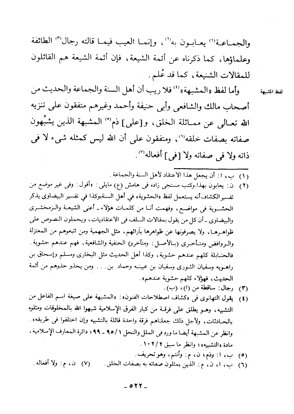 (¬4) يَقُولُ التَّهَانَوِيُّ فِي " كَشَّافِ اصْطِلَاحَاتِ الْفُنُونِ ": " الْمُشَبِّهَةُ عَلَى صِيغَةِ اسْمِ الْفَاعِلِ مِنَ التَّشْبِيهِ، وَهُوَ يُطْلَقُ عَلَى فِرْقَةٍ مِنْ كِبَارِ الْفِرَقِ الْإِسْلَامِيَّةِ شَبَّهُوا اللَّهَ بِالْمَخْلُوقَاتِ وَمَثَّلُوهُ بِالْحَادِثَاتِ، وَلِأَجْلِ ذَلِكَ جَعَلْنَاهُمْ فِرْقَةً وَاحِدَةً قَائِلَةً بِالتَّشْبِيهِ وَإِنِ اخْتَلَفُوا فِي طَرِيقِهِ ". وَانْظُرْ عَنِ الْمُشَبِّهَةِ أَيْضًا مَا وَرَدَ فِي الْمِلَلِ وَالنِّحَلِ 1/95 - 99 ; دَائِرَةَ الْمَعَارِفِ الْإِسْلَامِيَّةِ، مَادَّةَ " التَّشْبِيهِ " ; وَانْظُرْ أَيْضًا مَا سَبَقَ 2/102.