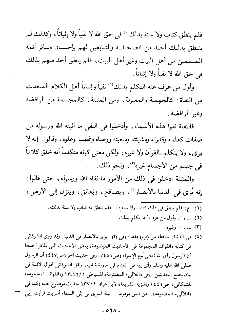 (¬4) فِي الدُّنْيَا: سَاقِطَةٌ مِنْ (ب) فَقَطْ ; وَفِي (أ) : يُرَى بِالْأَبْصَارِ فِي الدُّنْيَا. وَقَدْ رَوَى الشَّوْكَانِيُّ فِي كِتَابِهِ " الْفَوَائِدِ الْمَجْمُوعَةِ فِي الْأَحَادِيثِ الْمَوْضُوعَةِ " بَعْضَ الْأَحَادِيثِ الَّتِي يَذْكُرُ أَحَدُهَا أَنَّ الرَّسُولَ رَأَى اللَّهَ تَعَالَى يَوْمَ الْإِسْرَاءِ (ص 441) . وَفِي حَدِيثٍ آخَرَ (ص 447) أَنَّ الرَّسُولَ - صَلَّى اللَّهُ عَلَيْهِ وَسَلَّمَ - رَأَى رَبَّهُ فِي الْمَنَامِ فِي صُورَةِ شَابٍّ، وَنَقَلَ الشَّوْكَانِيُّ أَقْوَالَ الْأَئِمَّةِ فِي بَيَانِ وَضْعِ الْحَدِيثَيْنِ. وَفِي " اللَّآلِئِ الْمَصْنُوعَةِ " لِلسُّيُوطِيِّ 1/12 - 13 وَ " الْفَوَائِدِ الْمَجْمُوعَةِ " لِلشَّوْكَانِيِّ، ص 441 ; وَ " تَنْزِيهِ الشَّرِيعَةِ " لِابْنِ عِرَاقٍ 1/137 حَدِيثٌ مَوْضُوعٌ نَصُّهُ (كَمَا فِي اللَّآلِئِ الْمَصْنُوعَةِ) : عَنْ أَنَسٍ مَرْفُوعًا. . لَيْلَةَ أُسْرِيَ بِي إِلَى السَّمَاءِ أَسْرَيْتُ فَرَأَيْتُ رَبِّي بَيْنِي وَبَيْنَهُ حِجَابٌ بَارِزٌ مِنْ نَارٍ، فَرَأَيْتُ كُلَّ شَيْءٍ مِنْهُ حَتَّى رَأَيْتُ تَاجًا مُخَوَّصًا مِنَ اللُّؤْلُؤِ ".