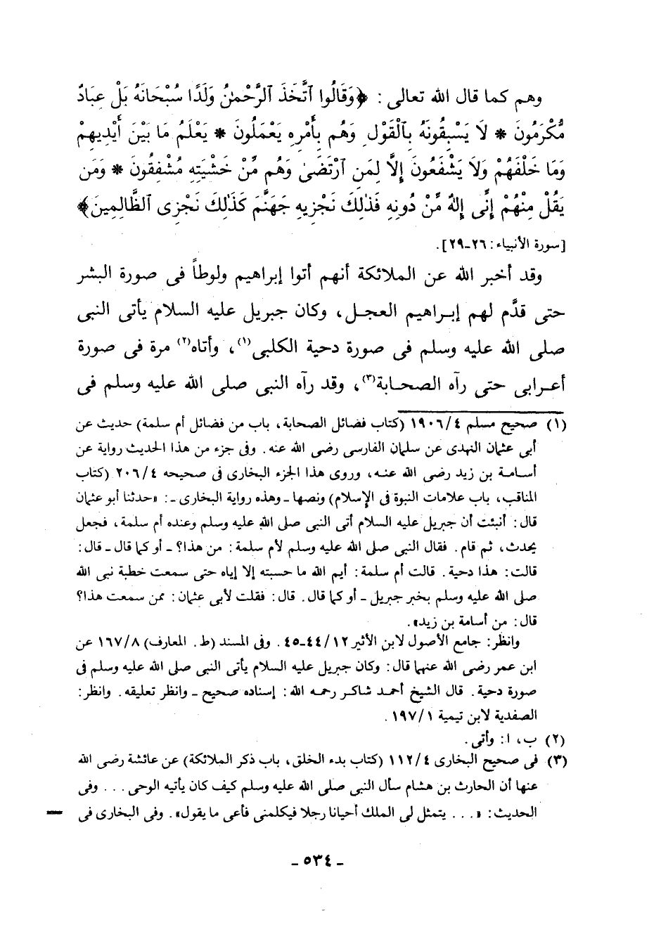 (¬3) فِي صَحِيحِ الْبُخَارِيِّ 4/112 (كِتَابُ بَدْءِ الْخَلْقِ، بَابُ ذِكْرِ الْمَلَائِكَةِ) عَنْ عَائِشَةَ رَضِيَ اللَّهُ عَنْهَا أَنَّ الْحَارِثَ بْنَ هِشَامٍ سَأَلَ النَّبِيَّ - صَلَّى اللَّهُ عَلَيْهِ وَسَلَّمَ - كَيْفَ كَانَ يَأْتِيهِ الْوَحْيُ. . . وَفِي الْحَدِيثِ: ". . يَتَمَثَّلُ لِي الْمَلَكُ أَحْيَانًا رَجُلًا فَيُكَلِّمُنِي فَأَعِي مَا يَقُولُ ". وَفِي الْبُخَارِيِّ فِي مَوْضِعَيْنِ آخَرَيْنِ 1