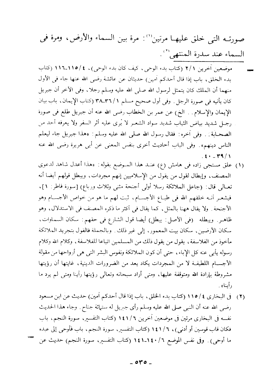 (¬2) فِي الْبُخَارِيِّ 4/115 (كِتَابُ بَدْءِ الْخَلْقِ، بَابُ إِذَا قَالَ أَحَدُكُمْ آمِينَ) حَدِيثٌ عَنِ ابْنِ مَسْعُودٍ رَضِيَ اللَّهُ عَنْهُ أَنَّ النَّبِيَّ - صَلَّى اللَّهُ عَلَيْهِ وَسَلَّمَ - رَأَى جِبْرِيلَ لَهُ سِتُّمِائَةِ جَنَاحٍ. وَجَاءَ هَذَا الْحَدِيثُ نَفْسُهُ فِي الْبُخَارِيِّ مَرَّتَيْنِ فِي مَوْضِعَيْنِ آخَرَيْنِ 6/141 (كِتَابُ التَّفْسِيرِ، سُورَةُ النَّجْمِ، بَابُ فَكَانَ قَابَ قَوْسَيْنِ أَوْ أَدْنَى) ، 6/141 (كِتَابُ التَّفْسِيرِ، سُورَةُ النَّجْمِ، بَابُ فَأَوْحَى إِلَى عَبْدِهِ مَا أَوْحَى) . وَفِي نَفْسِ الْمَوْضِعِ 6/140 - 141 (كِتَابُ التَّفْسِيرِ، سُورَةُ النَّجْمِ) حَدِيثٌ عَنْ عَائِشَةَ رَضِيَ اللَّهُ عَنْهَا سُئِلَتْ فِيهِ هَلْ رَأَى النَّبِيُّ - صَلَّى اللَّهُ عَلَيْهِ وَسَلَّمَ - رَبَّهُ؟ قَالَتْ فِي آخِرِ جَوَابِهَا: وَلَكِنْ رَأَى جِبْرِيلَ عَلَيْهِ السَّلَامُ فِي صُورَتِهِ مَرَّتَيْنِ. وَفِي نَفْسِ الْكِتَابِ، بَابٌ (لَقَدْ رَأَى مِنْ آيَاتِ رَبِّهِ الْكُبْرَى) 6/141 حَدِيثٌ عَنْ عَبْدِ اللَّهِ بْنِ مَسْعُودٍ رَضِيَ اللَّهُ عَنْهُ قَالَ: فَرَأَى رَفْرَفًا أَخْضَرَ سَدَّ الْأُفُقَ. وَفِي الْمُسْنَدِ (ط. الْمَعَارِفِ) عَنِ ابْنِ مَسْعُودٍ رَضِيَ اللَّهُ عَنْهُ عَنِ النَّبِيِّ - صَلَّى اللَّهُ عَلَيْهِ وَسَلَّمَ -: " رَأَيْتُ جِبْرِيلَ عَلَى سِدْرَةِ الْمُنْتَهَى وَلَهُ سِتُّمِائَةِ جَنَاحٍ. . الْحَدِيثَ. وَانْظُرِ الْبُخَارِيَّ 4/151 - 116 وَانْظُرِ الصَّفَدِيَّةَ 21/201 - 202.