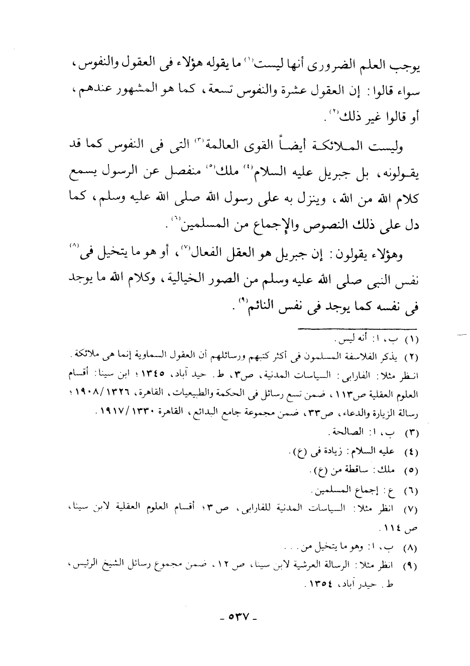 (¬2) يَذْكُرُ الْفَلَاسِفَةُ الْمُسْلِمُونَ فِي أَكْثَرِ كُتُبِهِمْ وَرَسَائِلِهِمْ أَنَّ الْعُقُولَ السَّمَاوِيَّةَ إِنَّمَا هِيَ مَلَائِكَةٌ. انْظُرْ مَثَلًا: الْفَارَابِيَّ: السِّيَاسَاتِ الْمَدَنِيَّةَ، ص [0 - 9] ، ط. حَيْدَرَ آبَادَ، 1345 ; ابْنَ سِينَا: أَقْسَامَ الْعُلُومِ الْعَقْلِيَّةِ ص [0 - 9] 13، ضِمْنَ تِسْعِ رَسَائِلَ فِي الْحِكْمَةِ وَالطَّبِيعِيَّاتِ، الْقَاهِرَةَ، 1326/1908 ; رِسَالَةَ الزِّيَارَةِ وَالدُّعَاءِ، ص 33، ضِمْنَ مَجْمُوعَةِ جَامِعِ الْبَدَائِعِ، الْقَاهِرَةَ، 1330/1917.