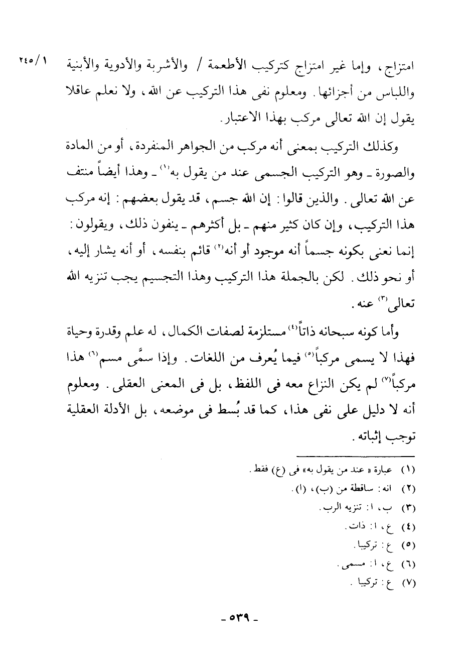 وَكَذَلِكَ التَّرْكِيبُ بِمَعْنَى أَنَّهُ مُرَكَّبٌ مِنَ الْجَوَاهِرِ الْمُنْفَرِدَةِ، أَوْ مِنَ الْمَادَّةِ وَالصُّورَةِ - وَهُوَ التَّرْكِيبُ الْجِسْمِيُّ عِنْدَ مَنْ يَقُولُ بِهِ (¬1) - وَهَذَا أَيْضًا مُنْتَفٍ عَنِ اللَّهِ تَعَالَى. وَالَّذِينَ قَالُوا: إِنَّ اللَّهَ جِسْمٌ، قَدْ يَقُولُ بَعْضُهُمْ: إِنَّهُ مُرَكَّبٌ هَذَا التَّرْكِيبَ، وَإِنْ كَانَ كَثِيرٌ مِنْهُمْ - بَلْ أَكْثَرُهُمْ - يَنْفُونَ ذَلِكَ، وَيَقُولُونَ: إِنَّمَا نَعْنِي بِكَوْنِهِ جِسْمًا أَنَّهُ مَوْجُودٌ أَوْ أَنَّهُ (¬2) قَائِمٌ بِنَفْسِهِ، أَوْ أَنَّهُ يُشَارُ إِلَيْهِ، أَوْ نَحْوُ ذَلِكَ. لَكِنْ بِالْجُمْلَةِ هَذَا التَّرْكِيبُ وَهَذَا التَّجْسِيمُ يَجِبُ تَنْزِيهُ اللَّهِ تَعَالَى (¬3) عَنْهُ.