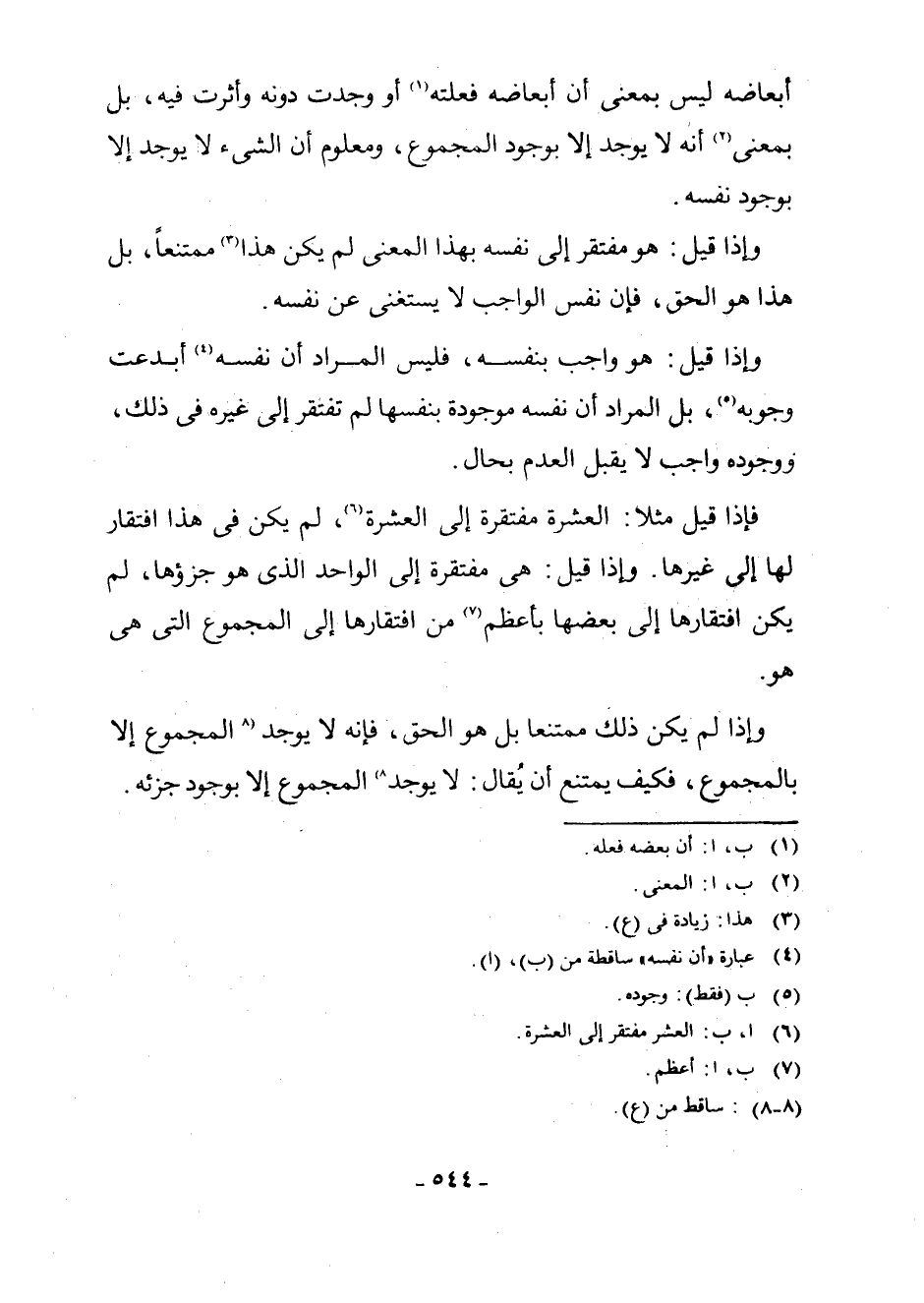 فَإِذَا قِيلَ مَثَلًا: الْعَشَرَةُ مُفْتَقِرَةٌ إِلَى الْعَشَرَةِ (¬6) ، لَمْ يَكُنْ فِي هَذَا افْتِقَارٌ لَهَا إِلَى غَيْرِهَا. وَإِذَا قِيلَ: هِيَ مُفْتَقِرَةٌ إِلَى الْوَاحِدِ الَّذِي هُوَ جُزْؤُهَا، لَمْ يَكُنِ افْتِقَارُهَا إِلَى بَعْضِهَا بِأَعْظَمَ (¬7) مِنِ افْتِقَارِهَا إِلَى الْمَجْمُوعِ الَّتِي هِيَ هُوَ.
